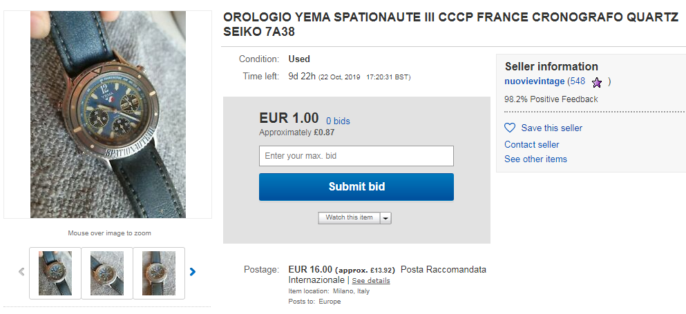 OROLOGIO YEMA SPATIONAUTE III CCCP FRANCE CRONOGRAFO QUARTZ SEIKO 7A38 STESSO MOVIMENTO SEIKO 7A38 STESSO MOVIMENTO FERRARI CARTIER CHE COSTAVA QUASI 2 MILIONI DELLE VECCHIE LIRE OROLOGIO ANNI 80 FRA I PRIMI CRONOGRAFI QUARTZ AL MONDO INSIEME AL SEIKO 7A28 JAMES BOND E SEIKO 7A38 MODELLO CRONOGRAFO DA COLLEZIONE RICERCATISSIMO DAGLI APPASSIONATI CASSA 43 MM SENZA CORONA STAINLESS STEEL QUADRANTE DI UNA BELLEZZA RARA Manca un pulsante cassa ore 16 IN CONDIZIONI ESTETICHE COME DA FOTO VENDUTO PER RICAMBI BUONA ASTA! A Partire DA 1 EURO SPEDIZIONE TRACCIABILE PAGAMENTO SICURO This Italian eBay seller is a blatant keyword spammer (I've seen him do this before), so I deliberately haven't copied over the last paragraph of his description. | |