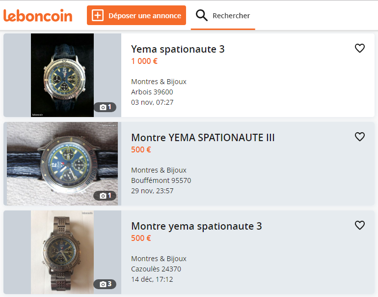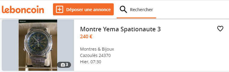 I ran a search on LeBonCoin this morning. Nothing new to speak of, as such, but I spotted that deluded French seller had re-listed his rough looking Yema Spationaute III, fitted with a non-original stainless bracelet, yesterday. The price is down from his original risible 500 Euros to 'only' 240 Euros. Probably still a fair way to go. http://www.leboncoin.fr/montres_bijoux/1739297035.htm/