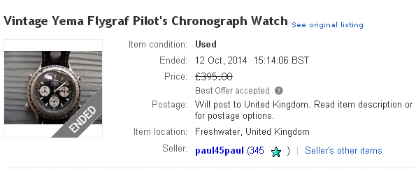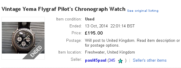 Speaking of instantly recognisable Yema N8's, I notice from my eBay watching page that the ex-Badingski ex-Timely_Classic Flygraf, discussed on the previous page (and prior to that on page 3 of this thread and elsewhere) sold yesterday against a best offer: http://www.ebay.co.uk/itm/121442723373 The seller had paid Timely_Classic £420 for this extremely rough ex-filipino Flygraf in January 2013. I did message him to confirm it was the same watch. Originally he'd listed it with a risible B-I-N price of £495, but after our exchange of messages, he immediately dropped the price to £395 - then two days later added this line to the description: PLEASE NOTE I WILL BE ON HOLIDAY BETWEEN 2ND OCTOBER AND 11TH OCTOBER. I WILL DEAL WITH ANY QUESTIONS ON MY RETURN. SORRY FOR ANY INCONVENIENCE. Presumably someone made an offer on it while he was away on holiday and he gratefully or grudgingly accepted it on his return. Unfortunately Goofbid's eBay Best Offer History tool hasn't picked it up, so I guess we'll never know how much the buyer paid. Belated Edit: Or perhaps we will. Seems that 'Best Offer' must have fallen through, because the seller subsequently re-listed it - sold for £195 as a B-I-N later today. http://www.ebay.co.uk/itm/121460049351
