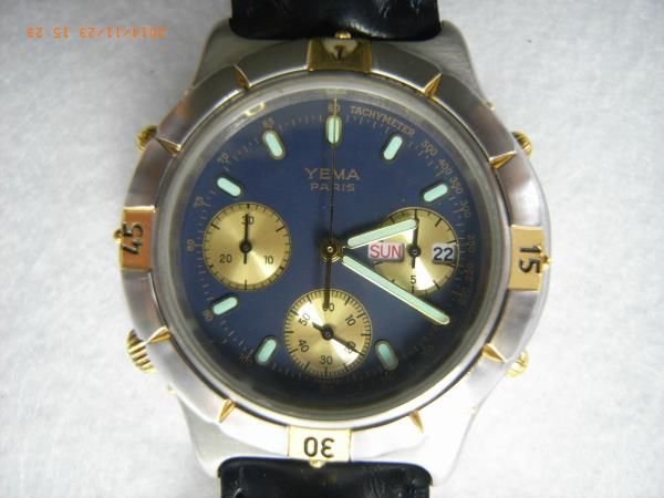 RETAIL VALUE $ 500.00 if available, rare! If you are looking for a high quality watch that is a true statement piece, this is the watch for you. Yema features movements by the Seiko. This quartz timepiece is known for quality workmanship, accurate timekeeping, and modern style! Water resistant to 50 meters, with lots of features! If you want a reliable watch for everyday, you can’t go wrong! Black leather band, 39 MM x 11MM with many working functions. There is no box or paperwork accompany the watch. This is an estate piece, probably from 2010-2012. It does show slight signs of wear typical of a gently used watch. No tears, discoloration, or defect in the leather band. No scratches on the crystal and dial features large Roman numerical. Must have for the watch collection. I say 'apparently', because if you google (any part) of the description, you can see where he copied it from (almost verbatim): http://www.buggysgoneshopping.com/Pages/Watches.aspx Remember Buggy's Yema N81W53 ? | |