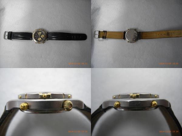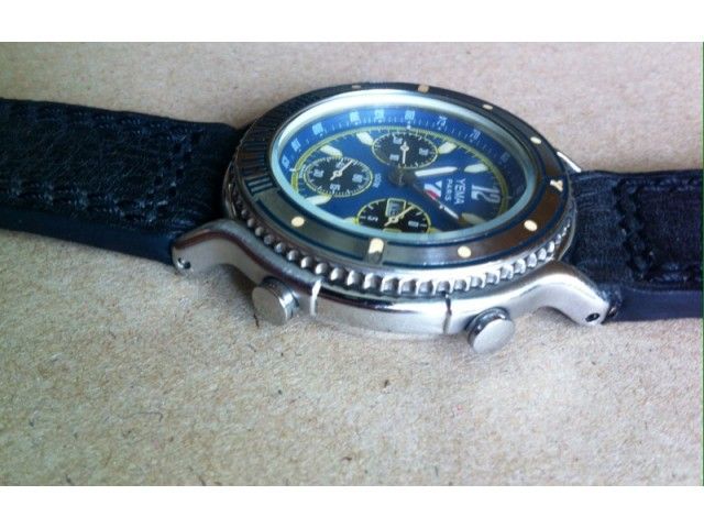 Apart from the strap having been replaced with one of 'pretty good quality' as stated in the seller's description .... Note also that the pushers appear to be devoid of their gold plating and the screw-down crown fitted is a non-original replacement. | |