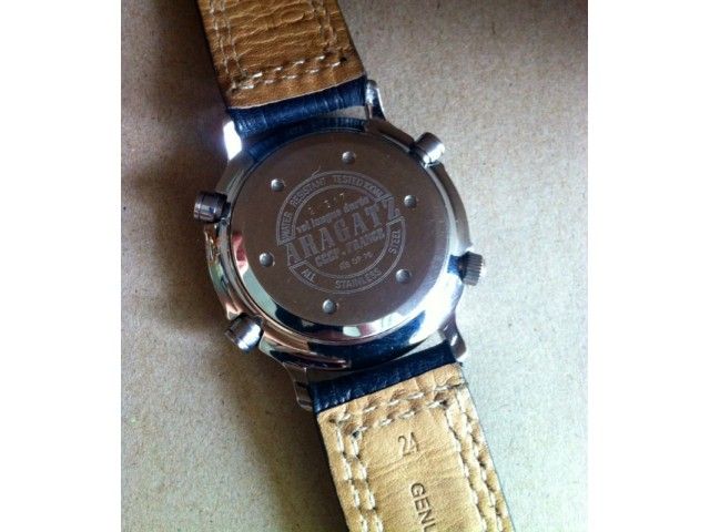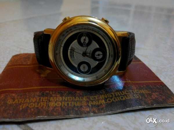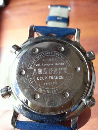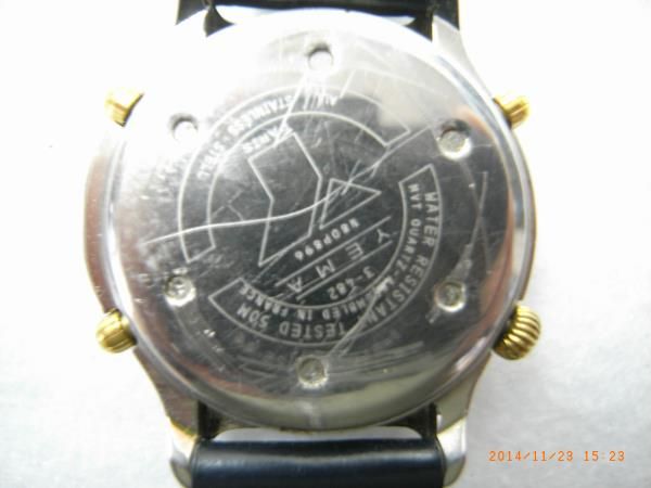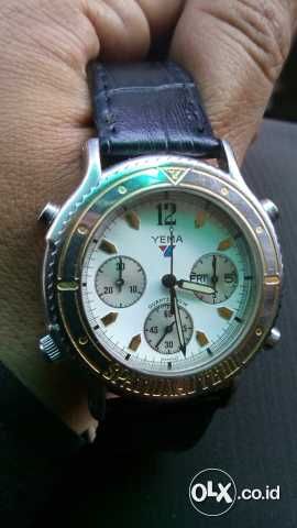 Here's another fairly grotty Yema Spationaute III listed recently by one of the multitude of Indonesian blogspot sellers .... This time another 38mm 'reduced' model N80A696 - which going by the state of the dial has suffered from moisture ingress. http://salejam.blogspot.com/2014/10/yema-spattonaute-iii-chrono-quartz.html Minggu, 19 Oktober 2014 YEMA SPATIONAUTE III Chrono Quartz YEMA SPATIONAUTE III Chronograph Quartz Size : 39mm Dial warna Putih dengan 3 buah sub dial Bezel stainless dengan komibnasi warna gold pada garis-garis dan tulisannya Terdapat 3 buah tombol pusher warna gold dan sebuah crown model drat Tertulis SPATIONAUTE III pada bezel nya Tertulis ARAGATZ dan CCCP France pada tutup belakang Water resist tested 100m Case tebal dan berat\ Tali nylon warna coklat baru MADE IN FRANCE " Yema Spationaute III commemorates a Franco-Russian space mission 'Aragatz' of December 1988. During the mission, French astronaut Jean-Loup Chretien made an EVA lasting 5 hours 57 minutes. The case-back of Spationaute III's are engraved 'Aragatz', 'vol longue duree and 'C.C.C.P. FRANCE'. There are two sizes of Spationaute III: this, the larger 43mm O, and a smaller 38mm O version.."
