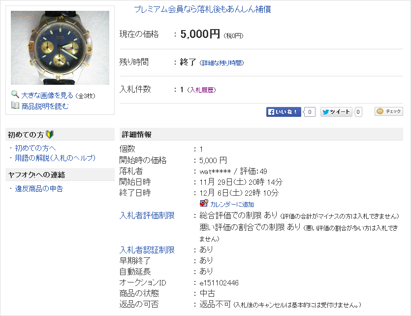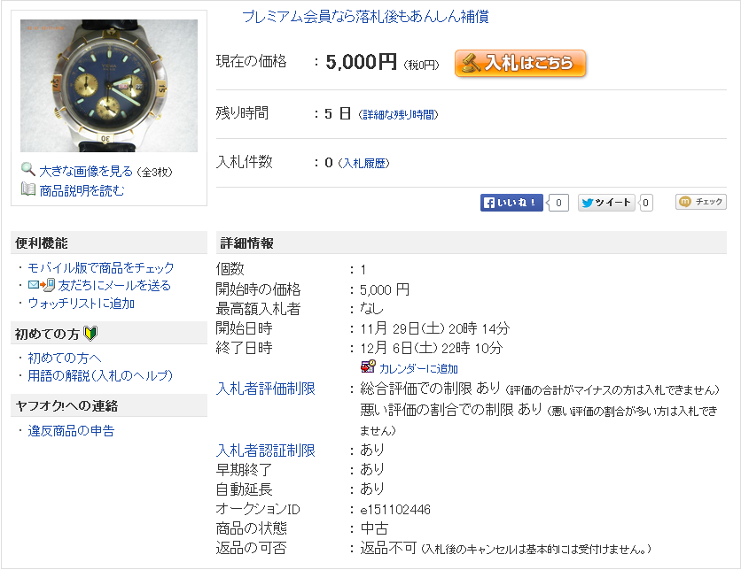 ※ Because last secondhand goods becomes, you will no claim no return. .. Not understand, the bid of a nervous person. I refuse. No bids placed on it so far, after 2 days, so this could end up being a bargain buy for someone at the opening bid price of 5000 Yen. The watch appears to be still fitted with the original dark blue leather Yema strap. Pity about the badly scratched case-back though. | |