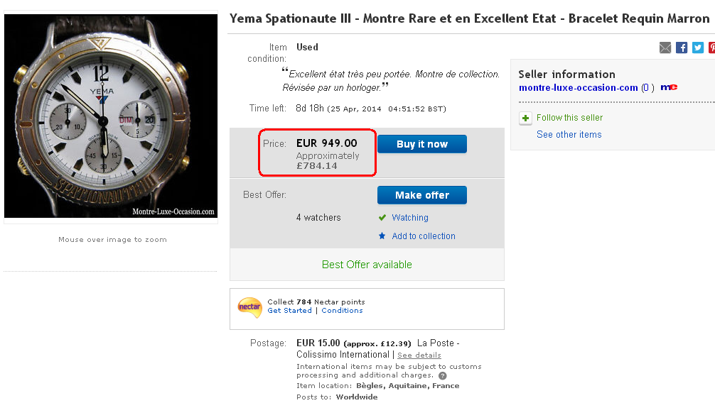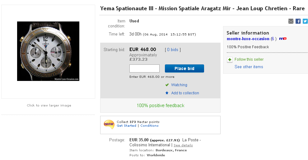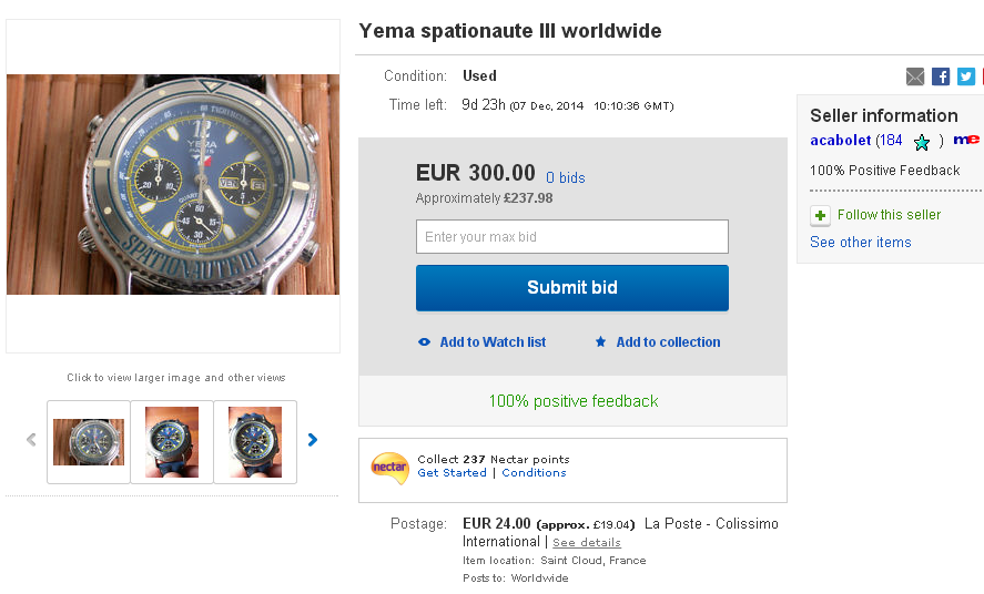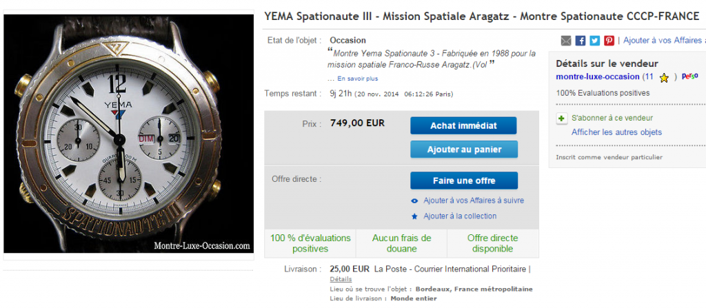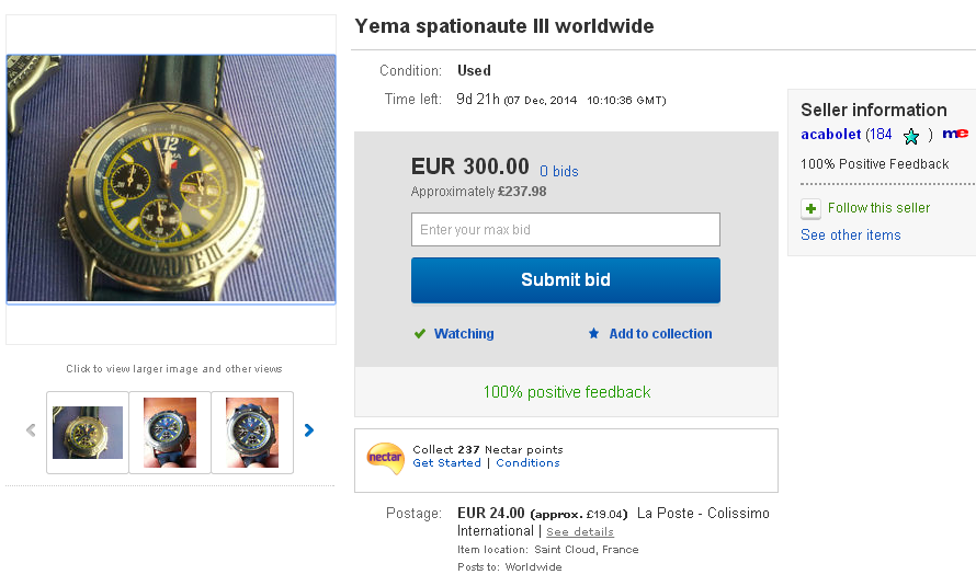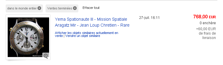 Well going by the postal code 75017 (and 17th Arrondissement) .... I now reckon they could both be the same person. This Yema Spationaute III 'cadran drapeaux' was listed on LeBonCoin earlier this evening - also priced @ 500 Euros. Montre YEMA Mission franco-sovietique ARAGATZ 1988 ![]() ![]() bailly - Mise en ligne le 26 novembre à 18:12. Prix : 500 € Ville : Paris Code postal : 75017 Description : Vends "collector "montre Yema ( original numéroté N8 OP 78 paiement cash liquide à l'exclusion de toutes autres moyens) tirage limité réalisé à l'occasion de la mission spatiale franco soviétique Soyuz TM-7/ MIR/ ARAGATZ au cours de laquelle le spationaute Jean-Loup CHRETIEN portait ce type de montre Waterproof 100m particulièrement résistante aux vibrations et aux chocs. Peu portée, pile à changer. Uniquement par téléphone 06 79 09 39 63 de10H à 22H00 et il ne sera pas répondu aux SMS ni aux Mails. Prix non négociable. A enlever sur place dans le 17eme. Although the LeBonCoin description is slightly different from last November's listing by 'mano', it's the fact that the seller is re-using the same 'stock image' (originally lifted from the 'Historique' section of the old Yema website), besides one of the actual watch for sale, that his price of 500 Euros is 'non-negotiable' and the name given this time is 'bailly', which helped me make the connection between these 3 listings. The name of the other would-be seller who advertised his Spationaute III 'cadran drapeaux' on those dating websites was .... Jean-Claude Bailly. I remember well, because I traded a couple of emails with this deluded would-be seller. Hence my subsequent post on page 9: I did actually make contact with the seller. Not only wouldn't he budge on his pie-in-the-sky asking price of 500 Euros .... Quote: The watch YEMA ARAGATZ is not sold yet because this watch is to be payed with Euros (500) in Paris where I live. But the only way he'd sell it was by a face-to-face meeting in Paris (that's when he's actually there) - for cash. Dream on. Translating the relevant parts of the current LeBonCoin advert's description, it appears he's still as intransigent as ever: Only by phone 06 79 09 39 63 between 10H-2200hrs and I will not respond to texts or to emails. Price not negotiable. To collect on site in the 17th (arrondissement). Payment in hard cash to the exclusion of all other means. I suspect he'll be re-listing it again another 12 months time. Hopefully he'll have got round to having the battery replaced by then. | |