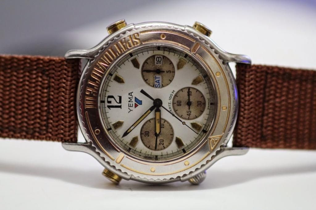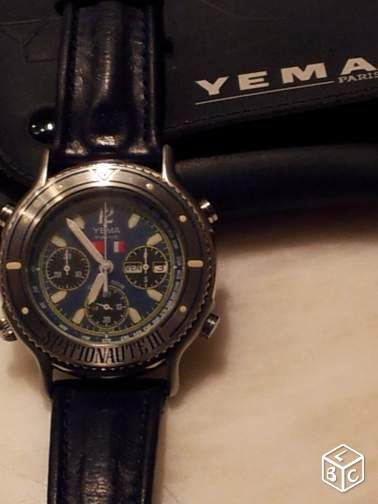 Collector Modèle Yema SPANIONAUTE III. Il s'agit d'un tirage limité réalisé à l'occasion de la mission spatiale franco soviétique Soyuz TM-7/ MIR/ ARAGATZ au cours de laquelle le spationaute Jean-Loup CHRETIEN portait ce type de montre Waterproof 100m particulièrement résistante aux vibrations et aux chocs. La pile a été changée il y a 1 mois Montre dans un état quasi neuf Ignore the primary image, because it's another 'stock photo' of a different watch (note the full complement of dial printing) lifted from Harry Bishop's Yema blog article. However the other 3 small photos are the same as Jecko used in his LeBonCoin listing in October.