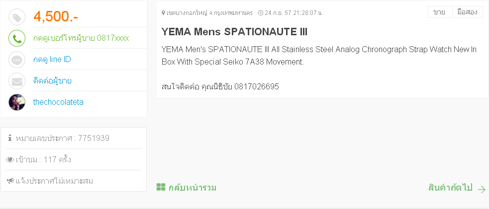 But it was this rather misleading listing for a 'New in Box' 43mm Spationaute III on the OLX Thailand site which grabbed my attention. (Note the format of OLX listings varies considerably between sites): http://www.olx.co.th/product-7751939/ YEMA Mens SPATIONAUTE III
