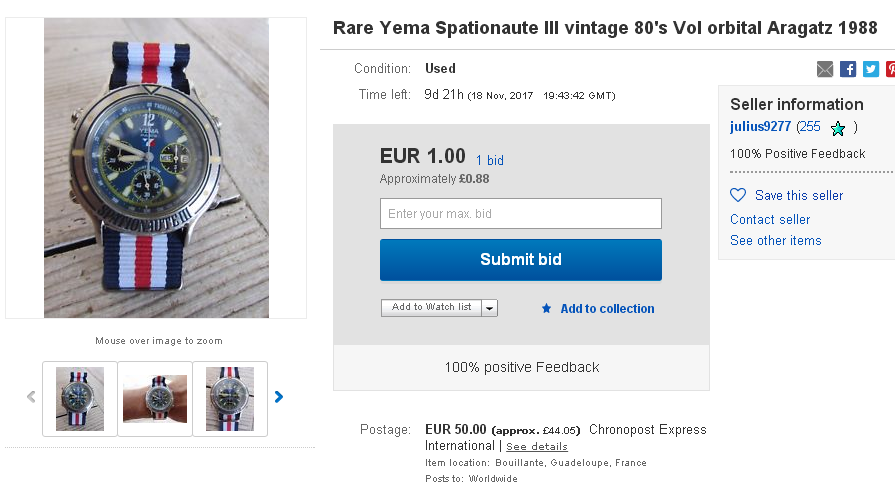 The above Italian eBay auction for a 'NOS' Yema Spationaute III ended yesterday evening, selling for 421 Euros after 58 bids. The unusually high number of bids was inflated by 2 bidders: who placed 16 and 21 bids each in small increments (usually 2 Euros). I'd suspect the (3) feedback bidder was another shill, as like the previous Zero feedback bidder, they also had 100% bidding activity with the seller. There seems to have been plenty of genuine interest besides; the listing received over 800 views during the course of 7 days. http://www.ebay.co.uk/itm/372115039383