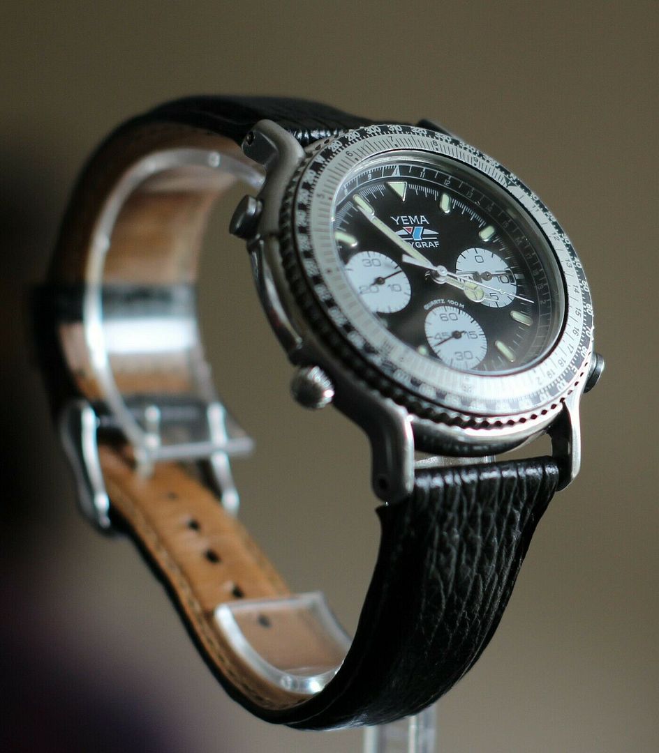 Yema Flygraf made in France when the Yema company was owned by Seiko, it is powered by the popular Seiko 7A38 caliber. Based on the 7A28 caliber, the first quartz analog chronograph in the world available in 1983, the 7A38 presented a year later was identical but with the addition of a day and date function. These movements lacked any plastic parts within the gear train and with their 15 jewels, they can be serviced and adjusted like any mechanical movement. This makes them almost indestructible but as a consequence, most watches with this caliber have been used and abused during decades and it becomes very hard to find one in nice cosmetic condition. The one for sale here has an unknown history but it has been really well preserved. The watch is all original and in very nice condition for being over 30 years old. No box or paper are included. It keeps excellent time and all functions work as they should. - Pull the crown on the bottom left one click and turn it one way to adjust the date, the other way to adjust the day and it can be set en French or in English. Press the top right pusher to adjust the position of the 1/10th s. chrono sub dial on the right. Press the bottom right pusher to adjust the position of the big second chrono hand and press the top left pusher to adjust the position of the chrono's small minute hand on the left. - Pull the crown two clicks to adjust the time. The crown is a diver screw in type one so it needs to be unscrewed before to be used. The chronograph stop, starts, runs and resets like it should, including the fast 1/10s hand. The outer bezel moves freely in both directions but has a little play so it probably needs a new rubber seal underneath. New battery installed. In case you didn't recognize it, there's a reminder at the top of this page. This is the same N8 Flygraf, which was eventually sold by French eBay seller 2015-mokra on 21st February, for a best offer of 150 Euros: https://cgi.ebay.co.uk/ws/eBayISAPI.dll?ViewItemVersion&item=254484081292
