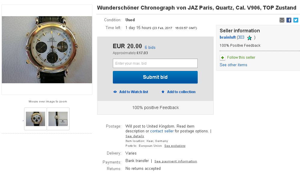 Best as one can tell from the two photos, it appears to be in good overall condition - apart from a nasty scratch on the case-back. Asking price is 200 Euros. | |
