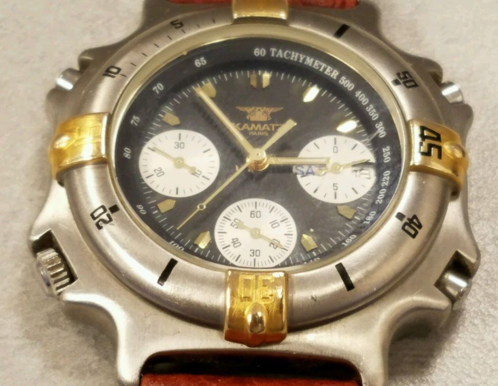 Spotted this Kamatz 517000 listed a few days ago by a US eBay seller. Unlike some previous examples of this dial colour variant I've seen in the past, the Silver paint doesn't appear to be flaking off the sub-dials. However, it suffering from one of the other common malaises of this watch - the black inlay paint is missing from 3 of the 4 quarter markers. Fortunately, the parochially-minded seller doesn't post to the UK. Apart from the grossly over-optimistic opening bid price of $199 - I really don't need another of these ! http://www.ebay.co.uk/itm/142283391405
