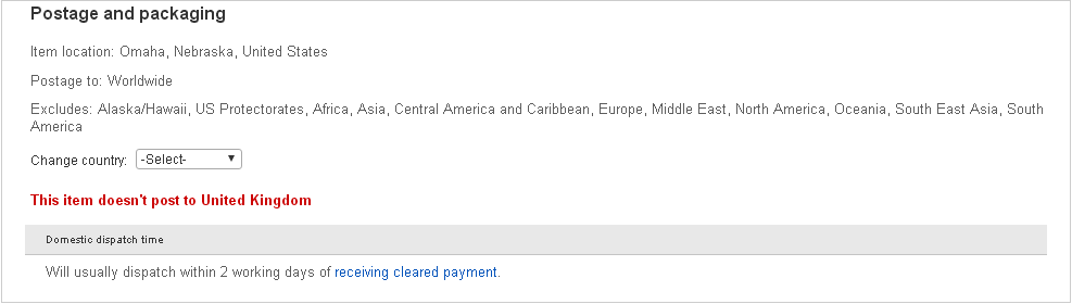 Up for auction is a rare Kamatz Paris 517000 watch in excellent condition. It has a new battery and band. Hang on a minute. You want a good laugh ? Note that in the listing screen print above, the item shows as 'Posts to Worldwide', but oddly excludes the United Kingdom. Just check out the full list of exclusions. 'Parochially-minded' doesn't even begin to describe the would-be seller's mentality.