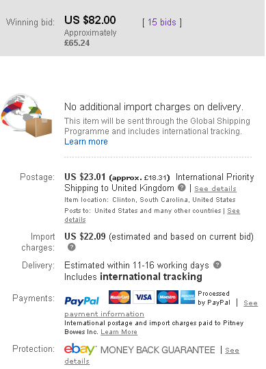Had I actually seen the auction, while it was live, I probably would have given him a good run for his money. Even with the additional $45 for eBay's GSP charges, it still wouldn't have been a bad buy, in that condition. | |