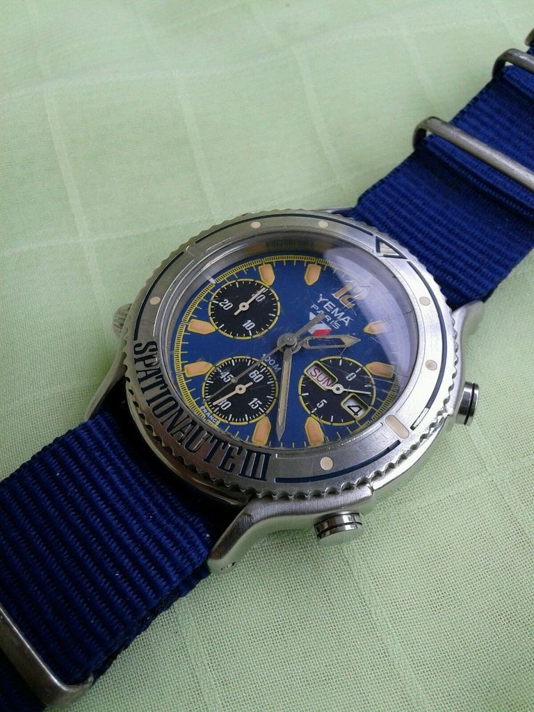 I'd meant to write up this next item last week, but simply didn't have time. If you've followed this thread, then you've possibly noticed that sightings of the 38mm 'reduced' Yema Spationaute III, with the blue dial, model # N80A66 are rather more scarce (in Europe and USA) than it's bigger 43mm diameter sibling. A good percentage of them seem to turn up in the Far East - indeed a number have been previously been offered by Indonesian blogspot sellers, which makes me wonder if Yema deliberately targetted this smaller diameter model at that market, because its smaller size might suit their wrists. This example, fitted with a blue NATO strap, which appears to have had a typically hard life and suffers from badly yellowed and missing lume, was listed on eBay last week by an Indonesian seller, with an opening bid price of $0.99. http://www.ebay.co.uk/itm/322351542779