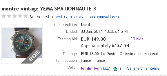 Sacré Bleu ! Just checking my eBay watching page and I noticed the re-listing by French eBay seller tombilibom for that tatty Yema Spationate III, fitted with that god-awful bracelet had ended yesterday evening, with two bids placed - selling for 153 Euros !! http://www.ebay.co.uk/itm/222383086031