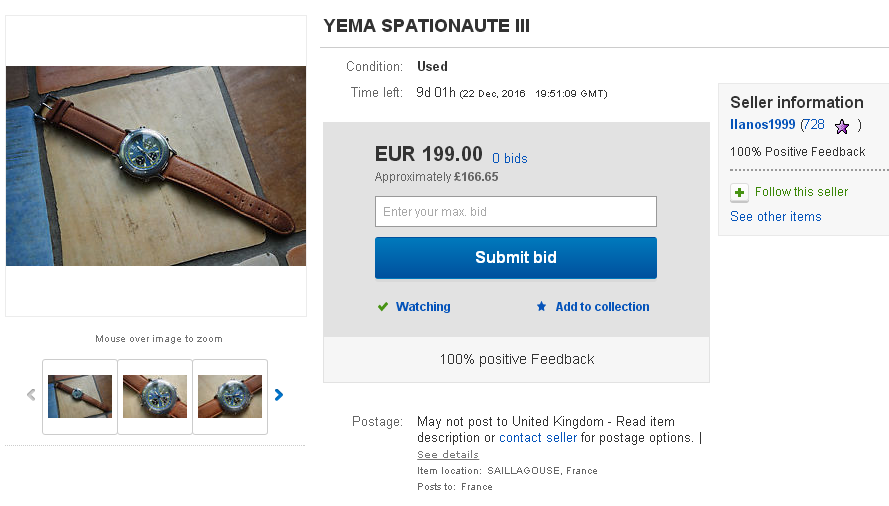 This same French eBay seller, tombilibom (who looking at some of his other wares, clearly falls into the category of incompetent watch botcher) is also listing a Yema Spationaute III (he even managed to mis-spell that, with 2 'N's, which is why I'd nearly missed spotting it). http://www.ebay.co.uk/itm/22236094931