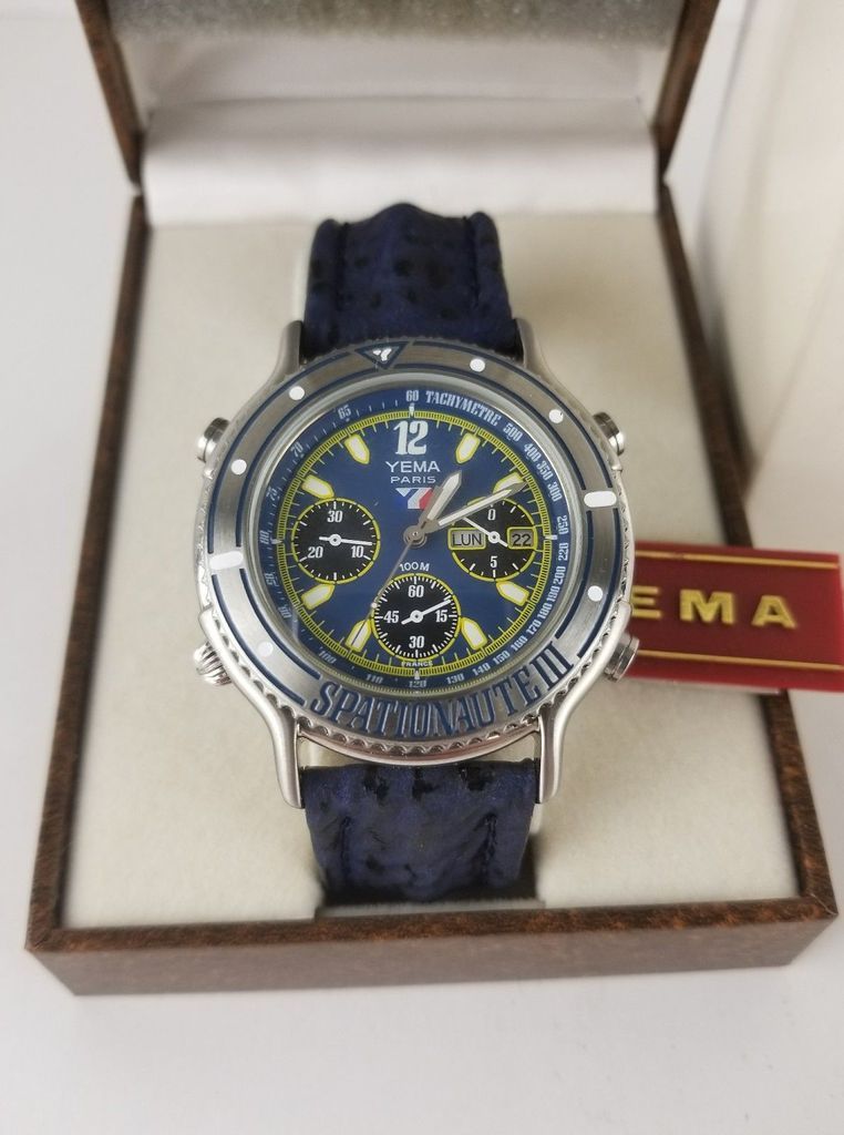 Vintage Yema Spationaute III Split Second Chronograph Day Date Watch New Old Stock "NOS". The watch has a new battery installed and has been in storage since the 90's. Original Box And tags. Take a close look at the pictures and ask any questions before purchasing. Thanks for looking. | |