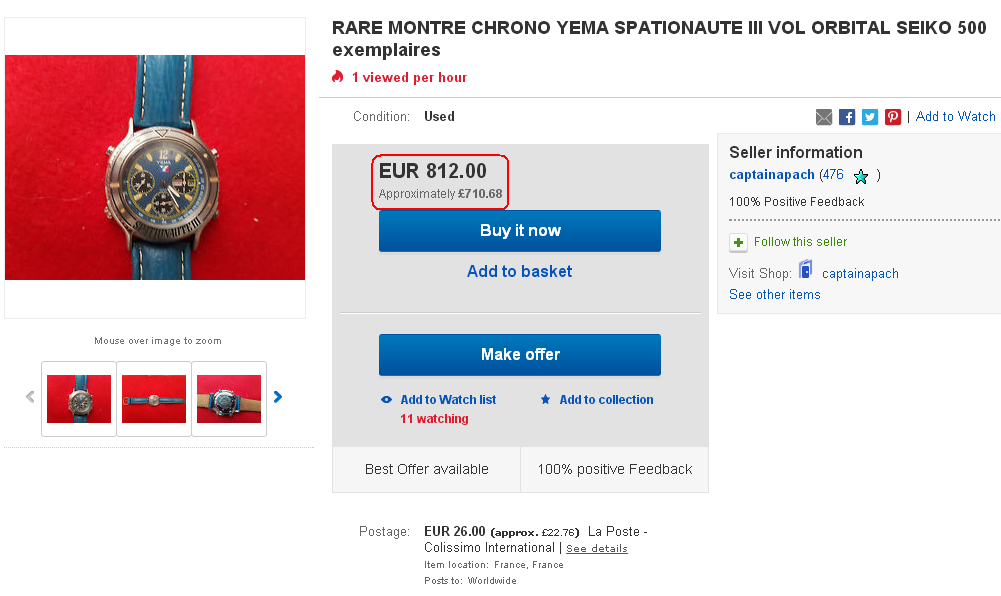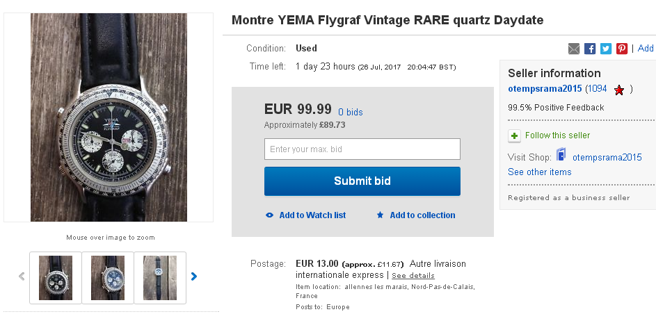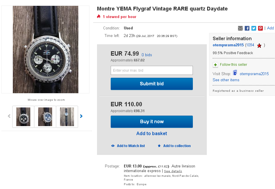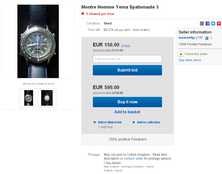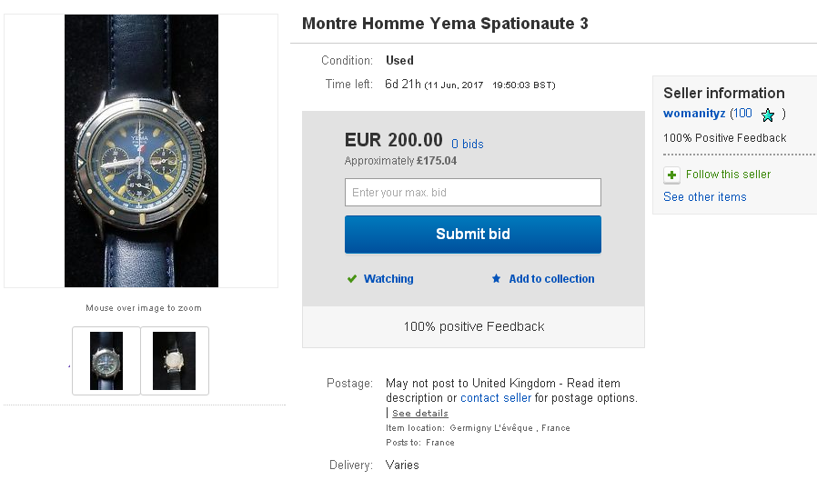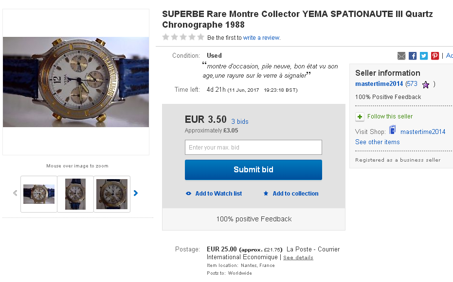 Meanwhile yesterday evening, another French eBay seller also listed a Yema Spationaute III, but as a 7-day auction, with a rather more sensible opening bid price of 200 Euros. http://www.ebay.co.uk/itm/122532865014