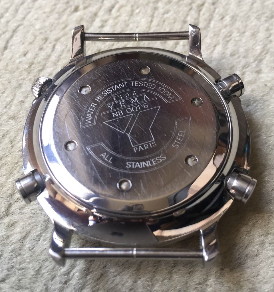 There was no price stated; simply 'make offer'. Obviously no strap, but still fitted with the original Yema strap push pins. Remembering, but not actually reciting my mantra: I really don't I contacted the seller and asked if he could send me the original high resolution photo and another of the watch's case-back. Which he kindly did: