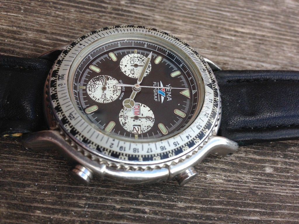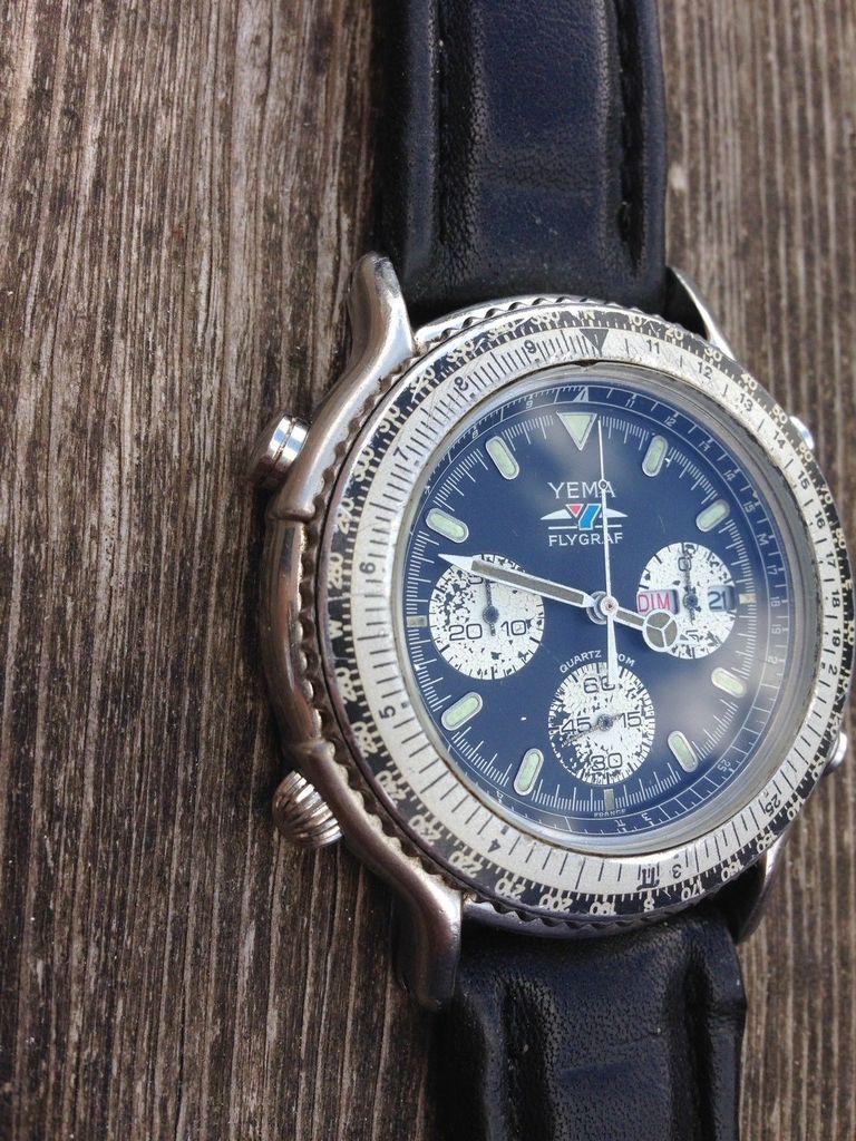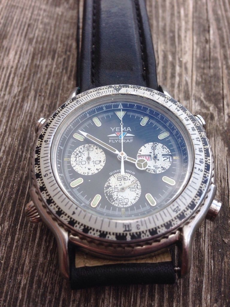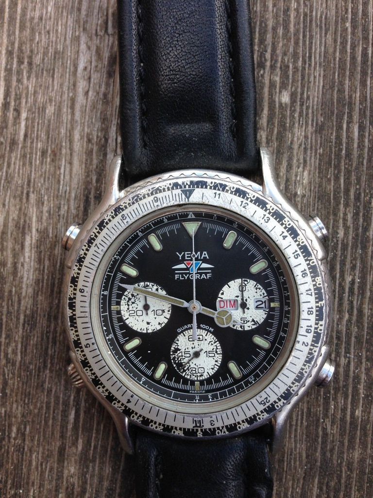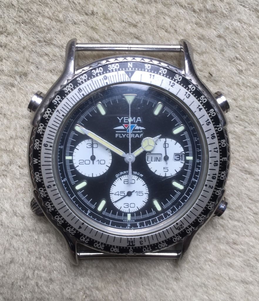 This poor example of a Yema N8 Flygraf was listed on Sunday evening by a French eBay seller as a 3-day auction, with an opening bid price of 99.99 Euros. For some reason, it's only just come up in my eBay saved search notifications. It's sad to admit that I almost immediately recognized the combination of discoloured hands lume and scabby flaking sub-dials. http://www.ebay.co.uk/itm/292193260324
