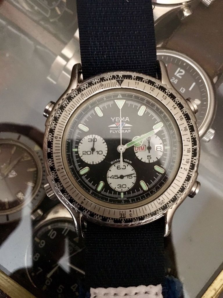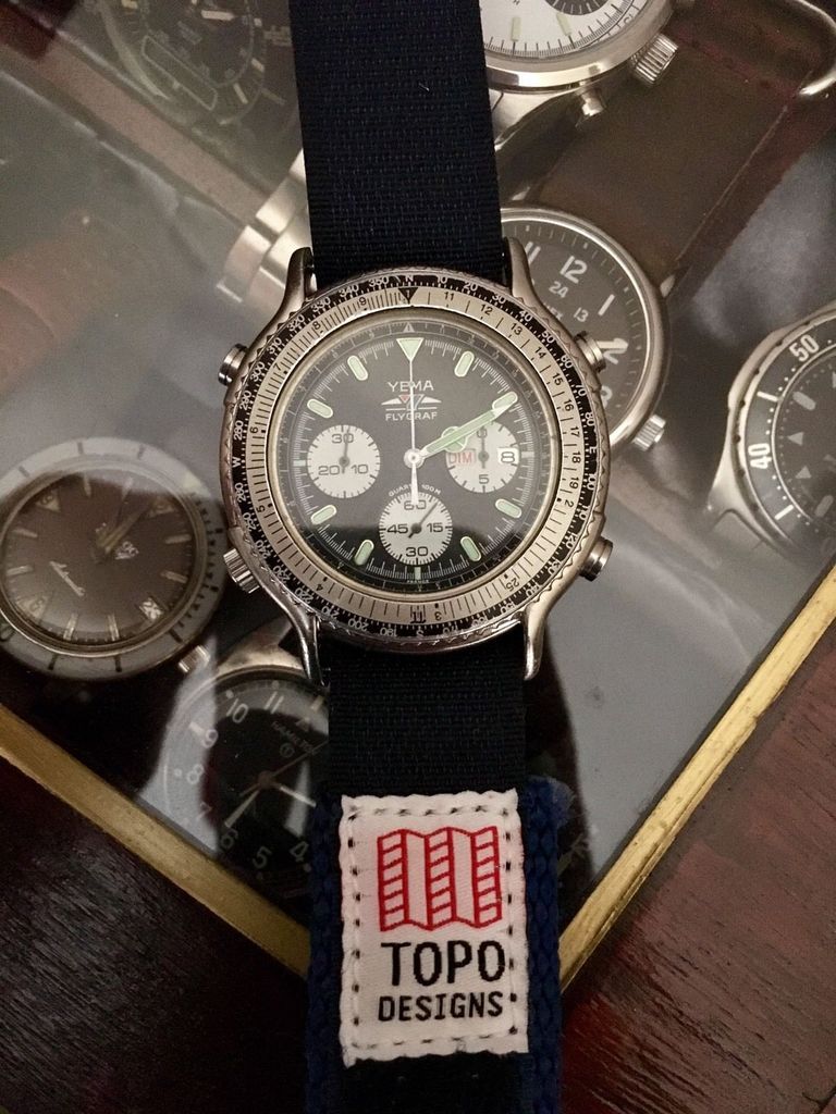 Very rare 1970s Yema Flygraf aviation chronometer. Freshly serviced, with original Yema leather 2 piece strap. The seller omits to mention that the watch has been fitted with a non-standard replacement screw-down crown. Not intending to deliberately nit-pick, but to my eyes, the hands' lume looks just a little too green (compared to the dial batons) I've got a pretty good memory for watches and somehow this Flygraf gave me that nagging feeling of Déjà Vu. The discrepancy in the colour of the lume (hands versus dial batons) and non-original screw-down crown seemed familiar, but the TOPO Designs Velcro strap (and the inclusion of the original Yema leather strap) threw me off track for a while. So I started paging back through this thread, until I found this post (including quote from page 13) from March 2015 towards the top of Page 14 ..... | |