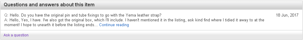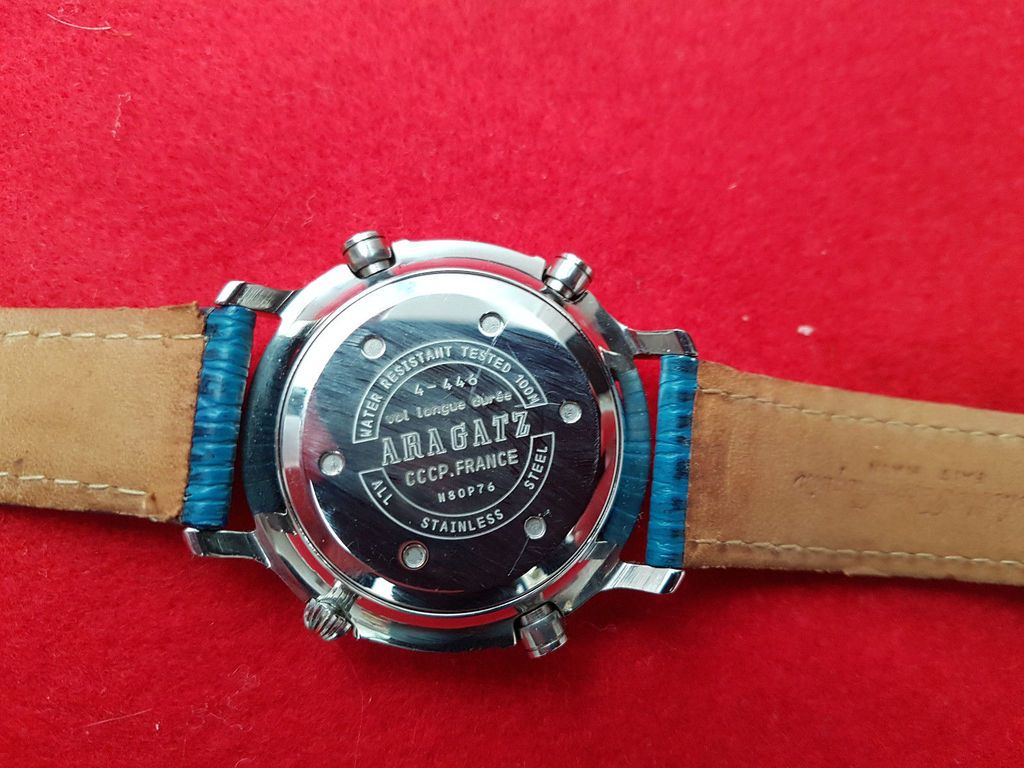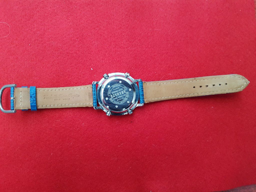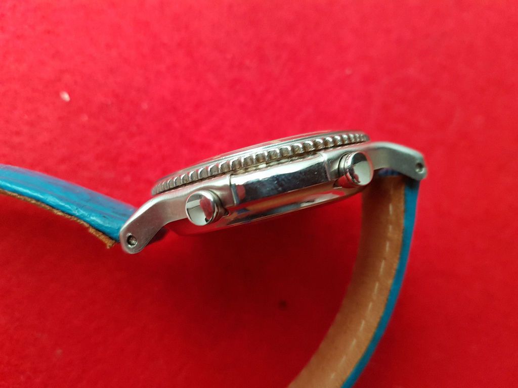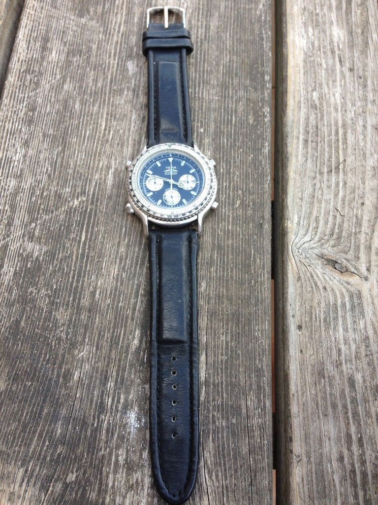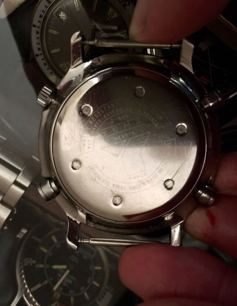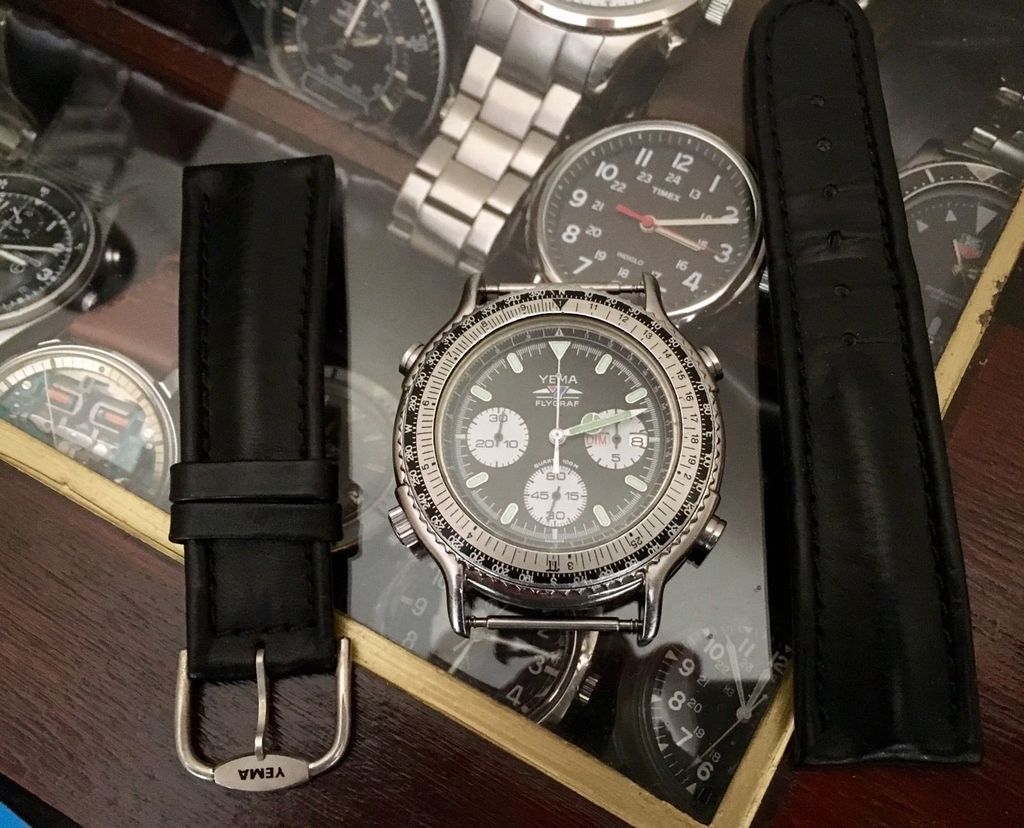 If you rotate and zoom in on the Romanian eBay seller's photo of the case-back, the serial number 2-805 matches. But that watch was fitted with a replacement leather strap. So where did the correct original Yema strap come from ? The current UK seller's photos appear to be taken above the backdrop of a collection box. Look at his last photo (of the case-back). Bottom left corner of that image is a Yema Yachtingraf L5 Ana-Digi, which I happen to know used the same strap as the N8 Flygraf. I wouldn't mind betting that's where the Yema strap came from - and where the original pair of pin and tube strap fixings remain. But I may be wrong about that. ![]() | |