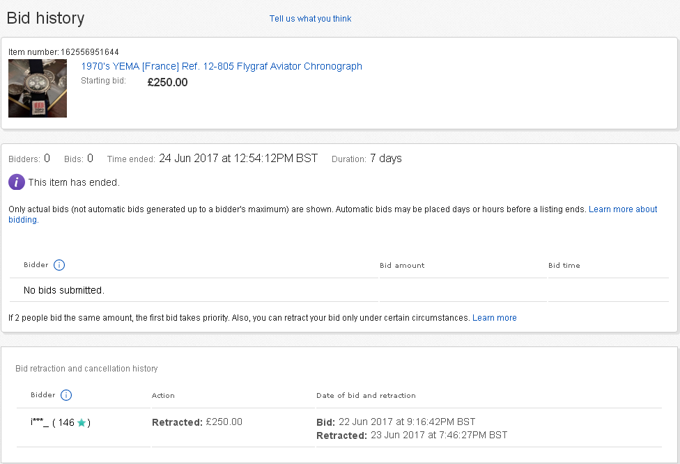 I had noticed there was a bid placed mid-week, but the bidder subsequently retracted it yesterday evening: http://www.ebay.co.uk/bfl/viewbids/162556951644?item=162556951644