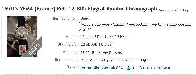 The UK eBay auction for a Yema N8 Flygraf ended a few moments ago with the watch unsold. http://www.ebay.co.uk/itm/162556951644