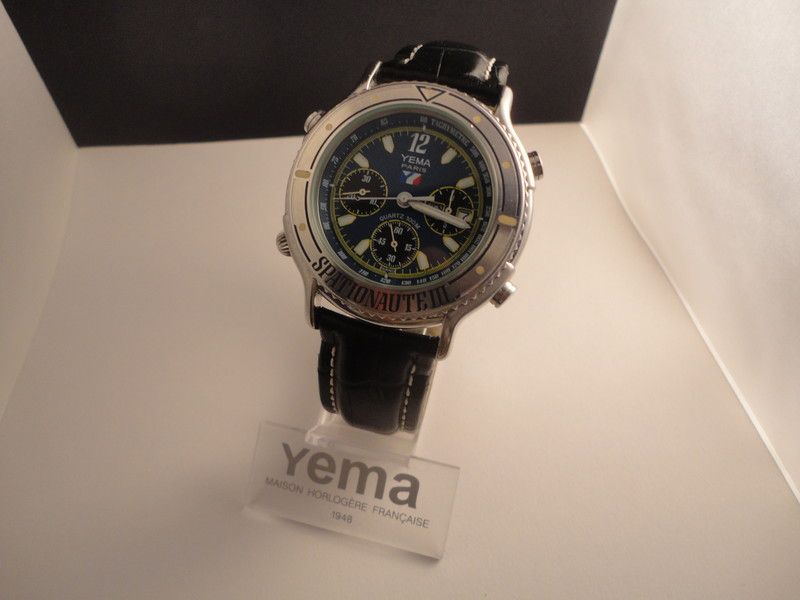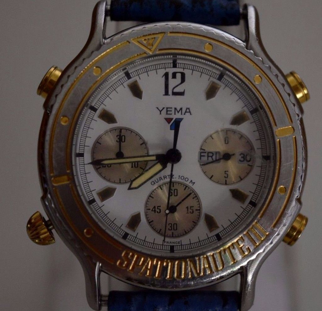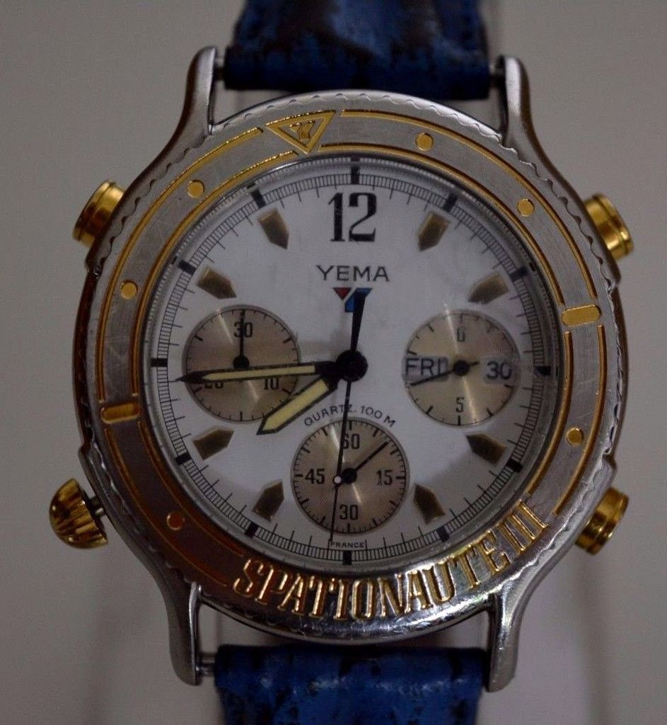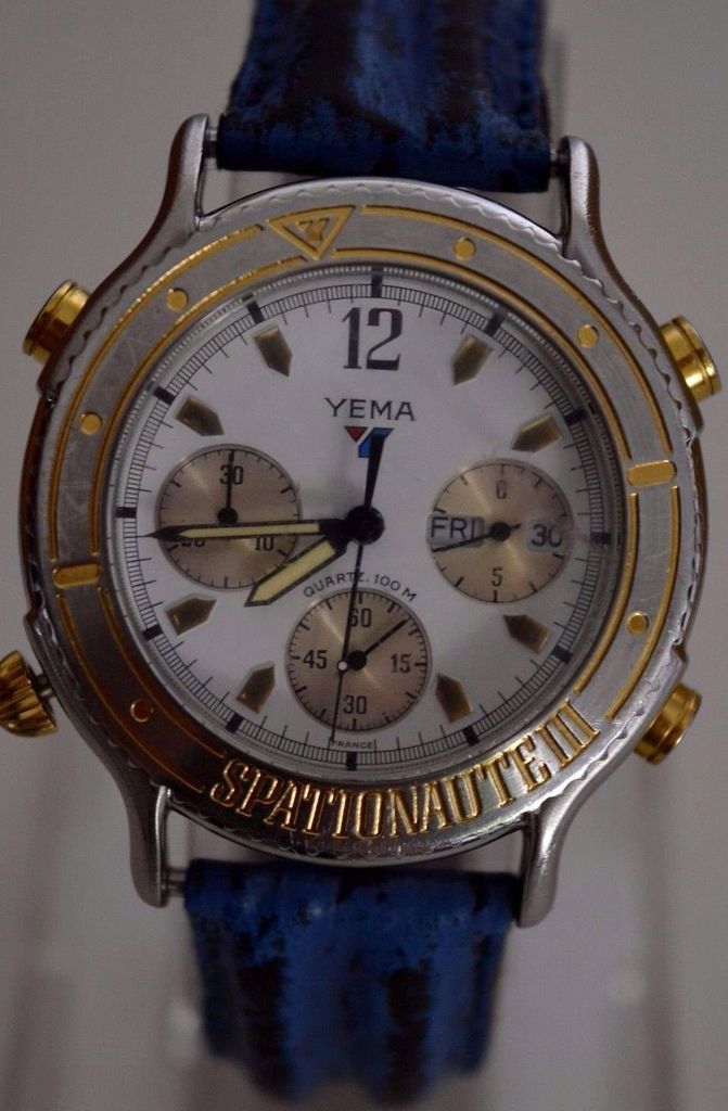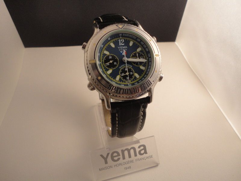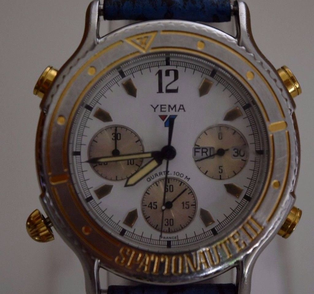 Here's a Yema Spationaute III, listed by a deluded French eBay seller, yesterday evening, with a risible 'pie-in-the-sky' Buy-it-Now asking price of 612 Euros !! The blue shark strap fitted is French made, but not the original Yema. Not sure where he gets the '500 exemplaires' in the title from. This is just a normal later production model, with what I call the 'minimal printing' dial (without PARIS or QUARTZ) from 1992, as shown by the case-back serial number 4-446. http://www.ebay.co.uk/itm/162522059987