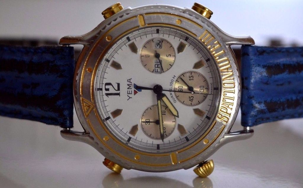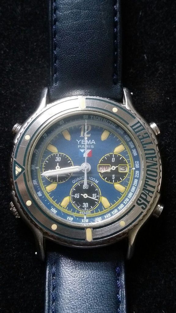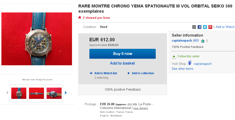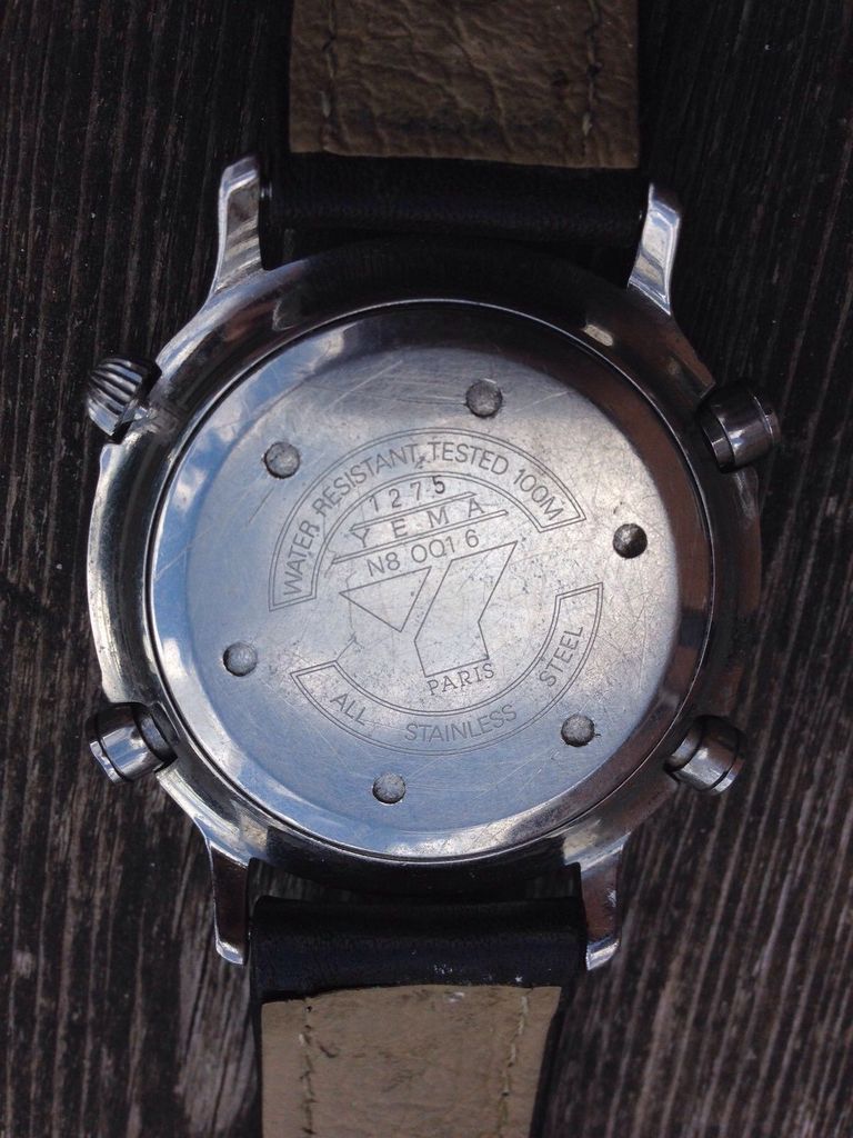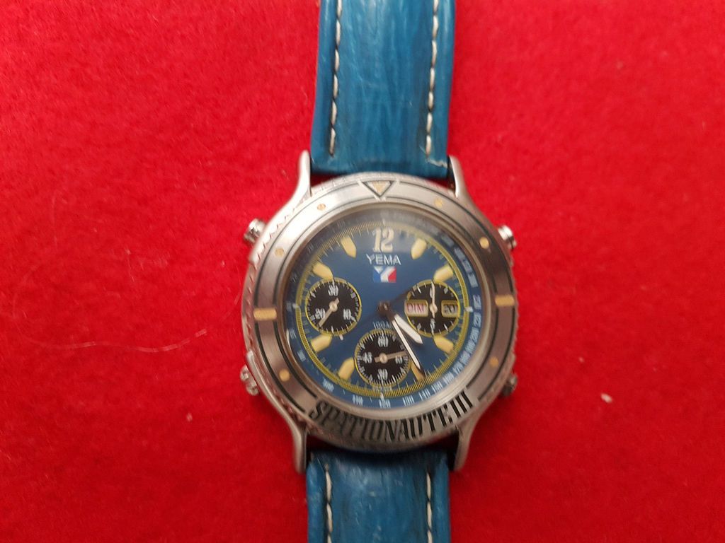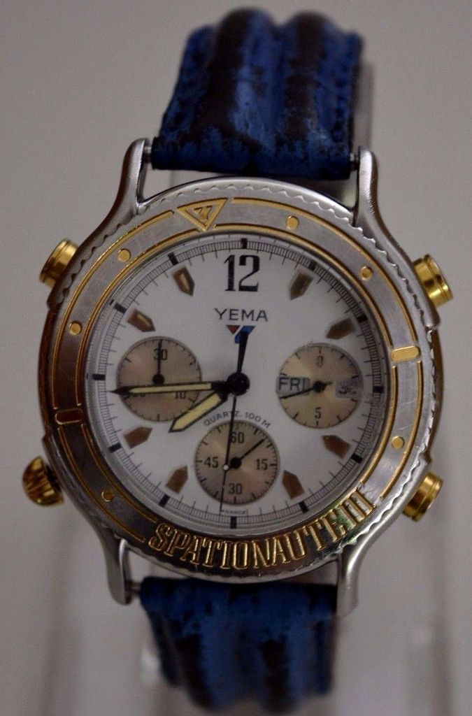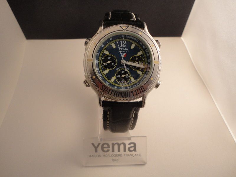 Here's a Yema Spationaute III, listed by a deluded French eBay seller, yesterday evening, with a risible 'pie-in-the-sky' Buy-it-Now asking price of 612 Euros !! The blue shark strap fitted is French made, but not the original Yema. Not sure where he gets the '500 exemplaires' in the title from. This is just a normal later production model, with what I call the 'minimal printing' dial (without PARIS or QUARTZ) from 1992, as shown by the case-back serial number 4-446. http://www.ebay.co.uk/itm/162522059987