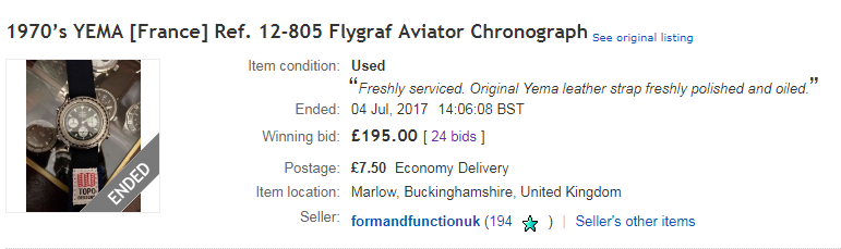 The re-listed UK eBay auction for a Yema N8 Flygraf ended a few moments ago, selling for £195 after 24 bids. http://www.ebay.co.uk/itm/162564653690