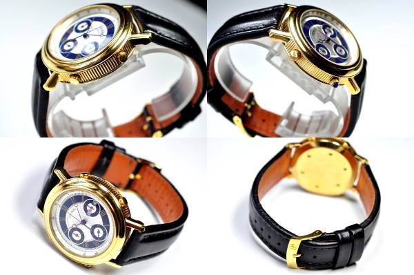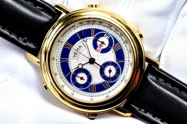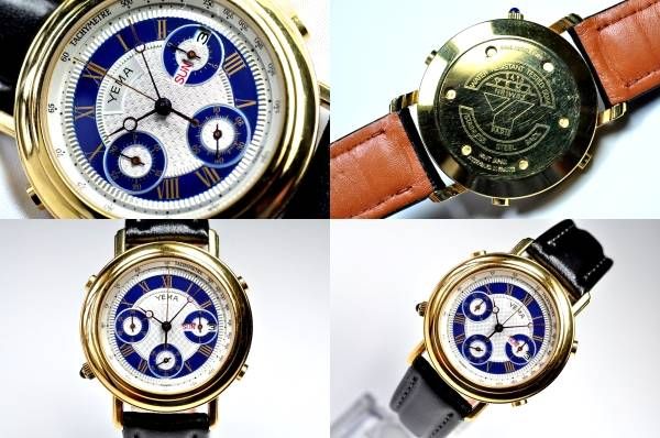 The second and third compound images are repeated in a slightly larger size, embedded in the description: Google translates the Japanese seller's title and description as follows: Yema YEMA ◆ Chronograph Swiss Men's Watch Quartz France Classic Gold Breguet Needle Roman Index It is a chronograph of YEMA's classical design. In France manufactured goods, the inside quartz is made in Japan. It is motion confirmed and moves normally. The dial is in good condition. The glass of the windshield has a few thread scratches. The case of the watch body, the back lid have fine threads and small scratches, but there are no big scratches or dirt. The belt is made of genuine leather made of Morerato. There is a feeling of use only a little. When making a bid, I will ship a new battery (made in Japan) and ship it. Please question on an uncertain point. Thanking you in advance. In addition, we have sent a lot of wristwatches (quartz, mechanical type) etc. for free shipping. If you do not mind, please visit the link below. * Size (excluding the crown) · 3.9 cm wide × 1.1 cm thick * around the arm · about 20 cm maximum * lug width · · · · · 2.0 cm (actually it's 19mm). * belt · · · external goods (made of Morerato) * Men's · · · · · Men's * Waterproof ····· 50 m waterproof * Machine · · · Quartz * Accessories · · · None | |