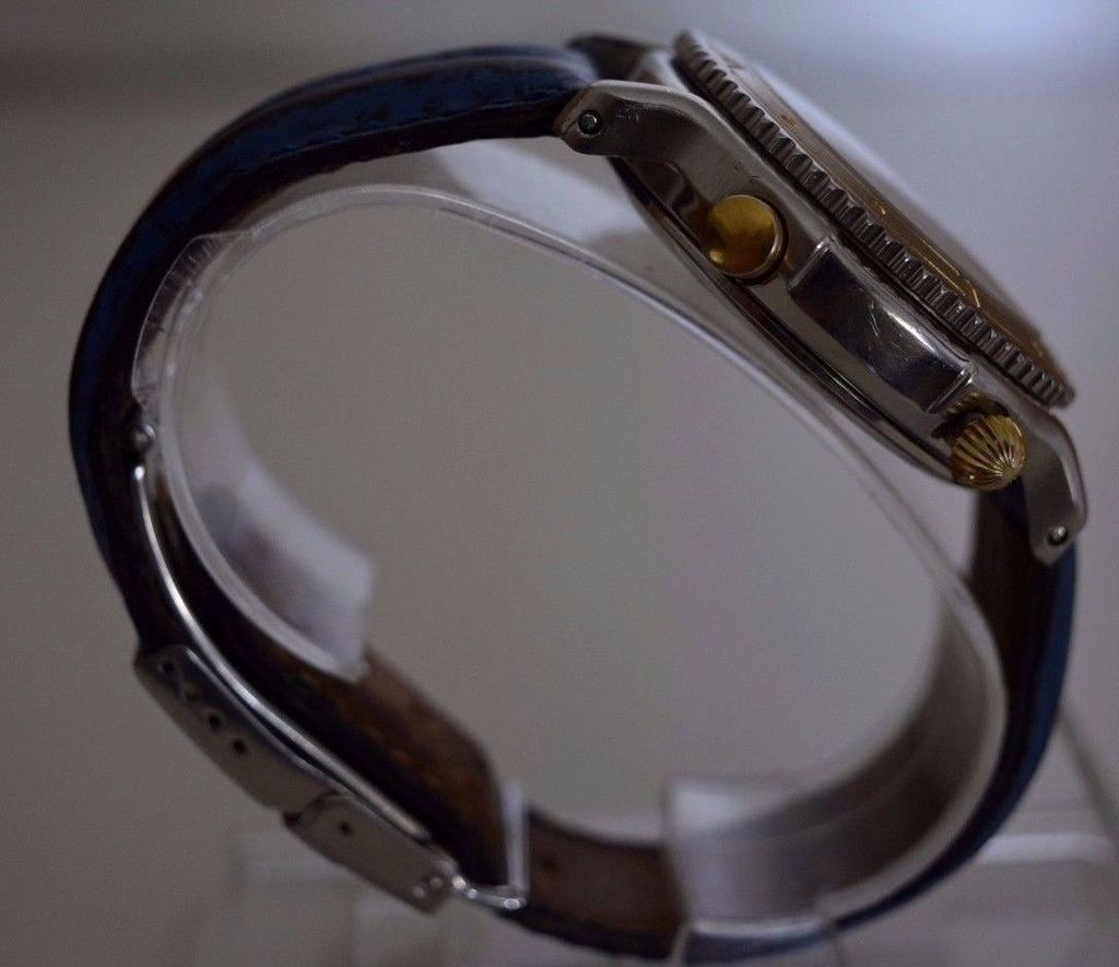 This two-tone 38mm diameter 'reduced' Yema Spationaute III, model # N80A696, in average worn condition, was listed yesterday evening by a French eBay seller, with an opening bid of 1 Euro and no reserve. That said, it's one of those private listings - bidder identity protected, so wide open to shill bidding. Although the seller states a new battery has been fitted, in all the head on photos the watch is showing exactly the same time, with the seconds hand on 8 seconds. For reasons best known to himself, the seller has the screw-down crown fully hacked. http://www.ebay.co.uk/itm/152575724880