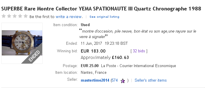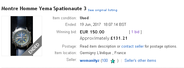 The reason I'd deliberately delayed posting the above result, was that I was hoping to 'kill two birds with one stone', by reporting the result of the other French eBay auction, for that full sized Yema Spationaute III (which was ending 25 minutes later) in the same post. I'd half expected it would have sold for the 200 Euros opening bid price, in the closing seconds, but there were no takers. http://www.ebay.co.uk/itm/122532865014