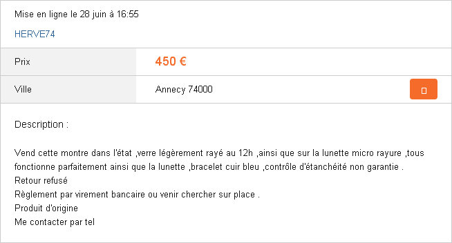 As can be seen by zooming in on the original full-sized photo, there are a number of small scratches on the crystal, but nothing too bad. The case-back is in a lot better condition than many I've seen - without the usual slipped tool graunch marks. To gauge if he had any idea of price (and no other reason), I made the seller what I considered a fair offer. He neither accepted nor declined. I have managed to establish that he has no PayPal. He's also reluctant to accept payment by Bank Transfer, because he's unwilling to divulge his bank details to a stranger. So all I can say is Bon Chance to anyone else who fancies a try ! | |