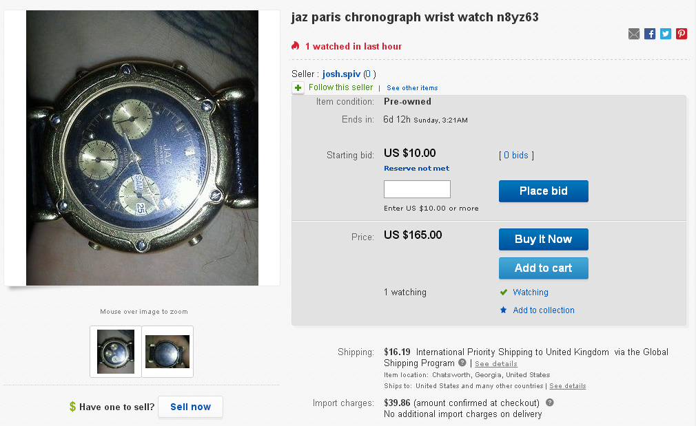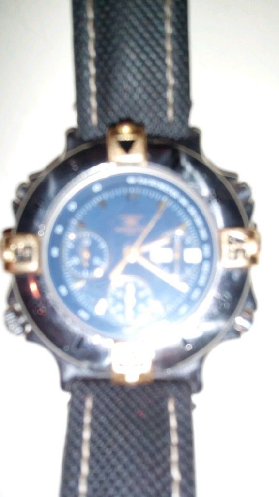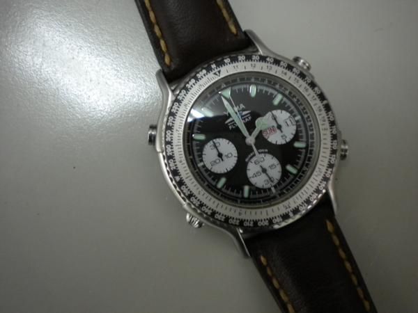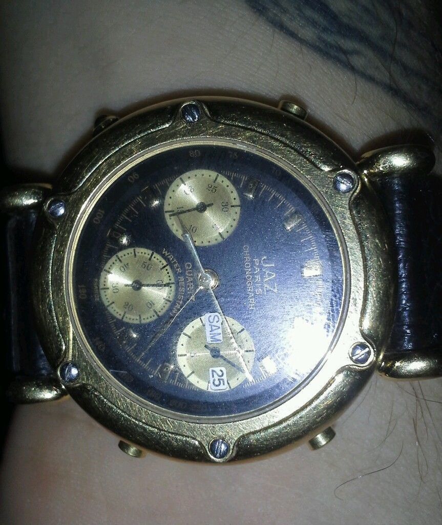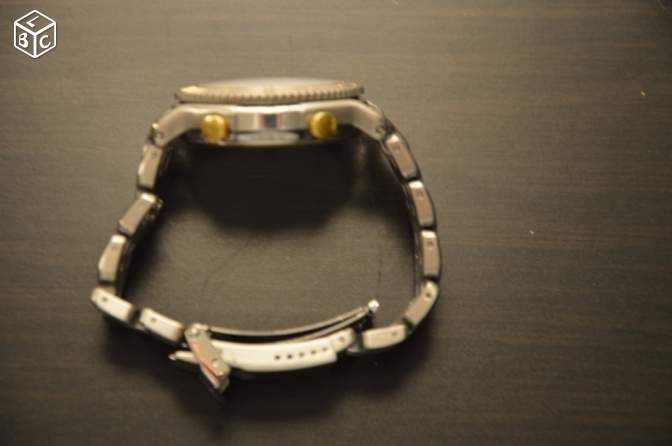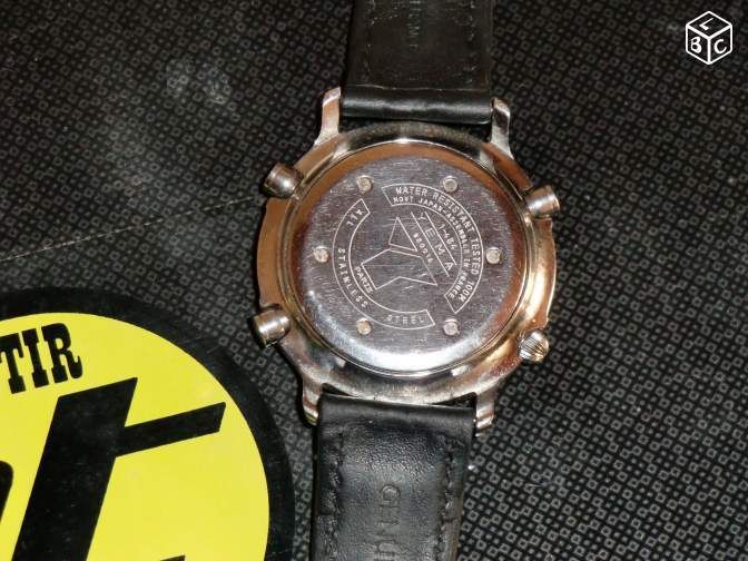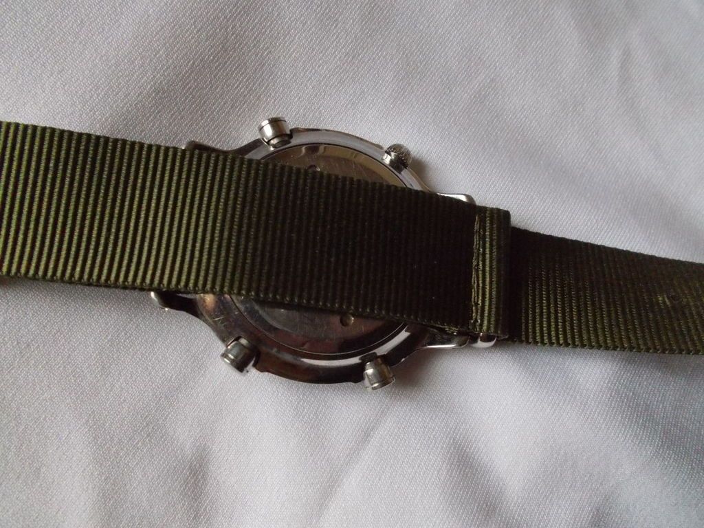 PAS DE COMPTE PAYPAL. ACCEPTE TOUT PAIEMENTS SAUF PAYPAL. REMISE EN MAIN PROPRE POSSIBLE POUR LES REGIONAUX. BON FONCTIONNEMENT ET DE TOUTE SES FONCTIONS. CHRONO AVEC ARRET ET RATTRAPANTES. SYSTEME CHRONO STOP. DIAMETRE DU BOITIER 43 MM. BRACELET NATO DE COULEUR KAKI.SYSTEME A QUARTZ AVEC PILE NEUVE MONTEE. MONTRE DANS SON JUS AVEC PETITES ALTERATIONS SUR LES PETITS CADRANS ET LUNETTE. VOIR AUSSI MES AUTRES VENTES. BONNES ENCHERES N ENCHERISSEZ PAS SUR MES VENTES SI VOTRE SEUL MOYEN DE PAIEMENT EST PAYPAL. MERCI A VOUS CHERS EBAYEURS. Not only is the watch in rather poor cosmetic condition - viz: scabby sub-dials, discoloured hands lume and badly worn bezel markings ('minor alterations' as he describes them), but the seller is at pains to makes it clear he doesn't take PayPal. Probably one best avoided - unless you're French and désespéré ! | |