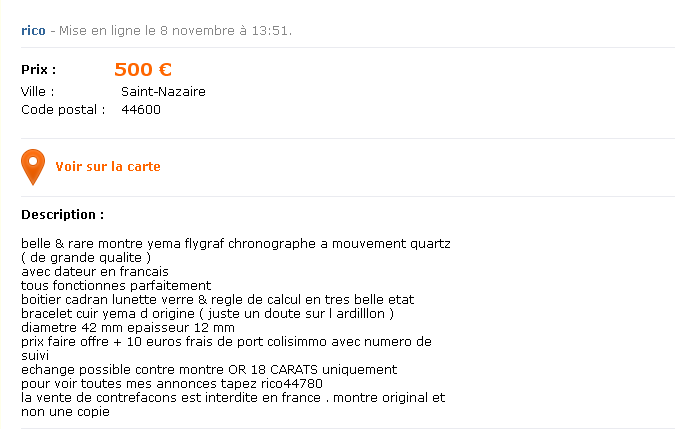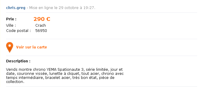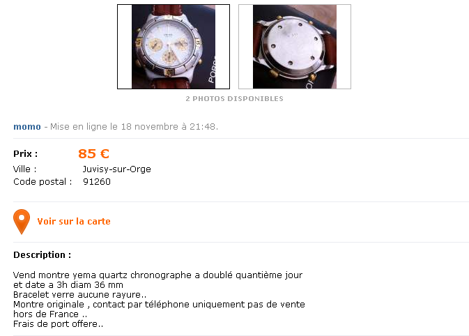 That Yema N80P896 Pseudo Plongeur was re-listed on LeBonCoin yesterday evening - with a different title and description .... Montre yema double quantième (but still using the same 2 photos from the previous listing): ![]() One can only assume that the price hike from 70 to 85 Euros means the would-be seller has had the battery replaced. ![]() | |
