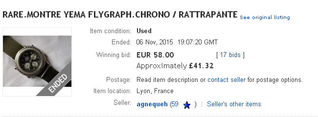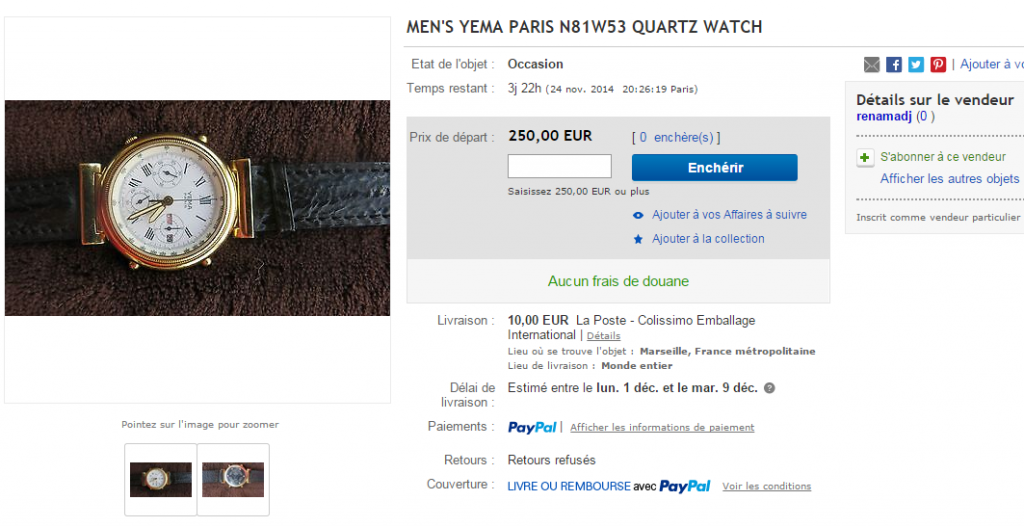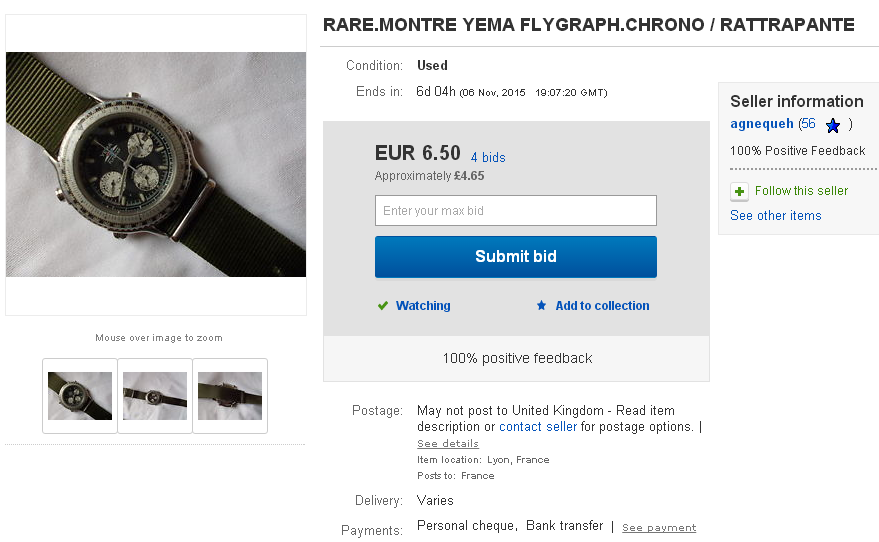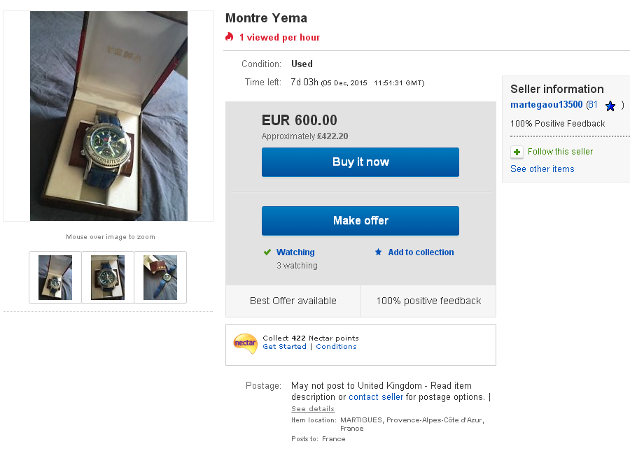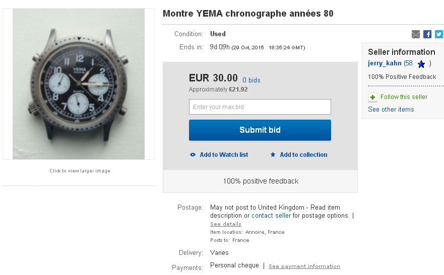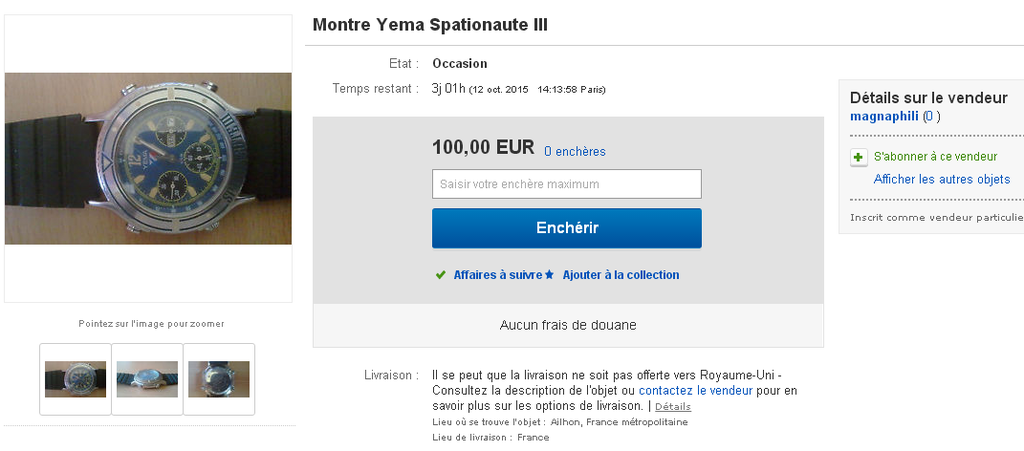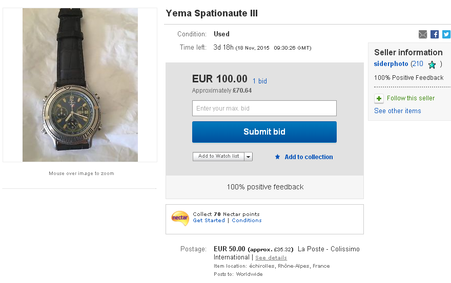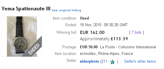 Here's another average used condition Yema Spationaute III (fitted non-original strap) listed on eBay France a couple of days ago. The opening bid price of 100 Euros is reasonable, but the Collisimo international postage charges of 50 Euros borders on extortion. So although being offered Worldwide, it's pretty much guaranteed of going to a French buyer. http://www.ebay.co.uk/itm/131651374616