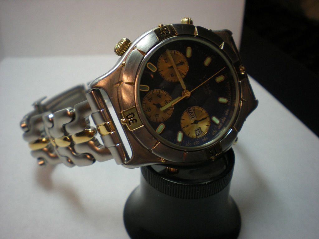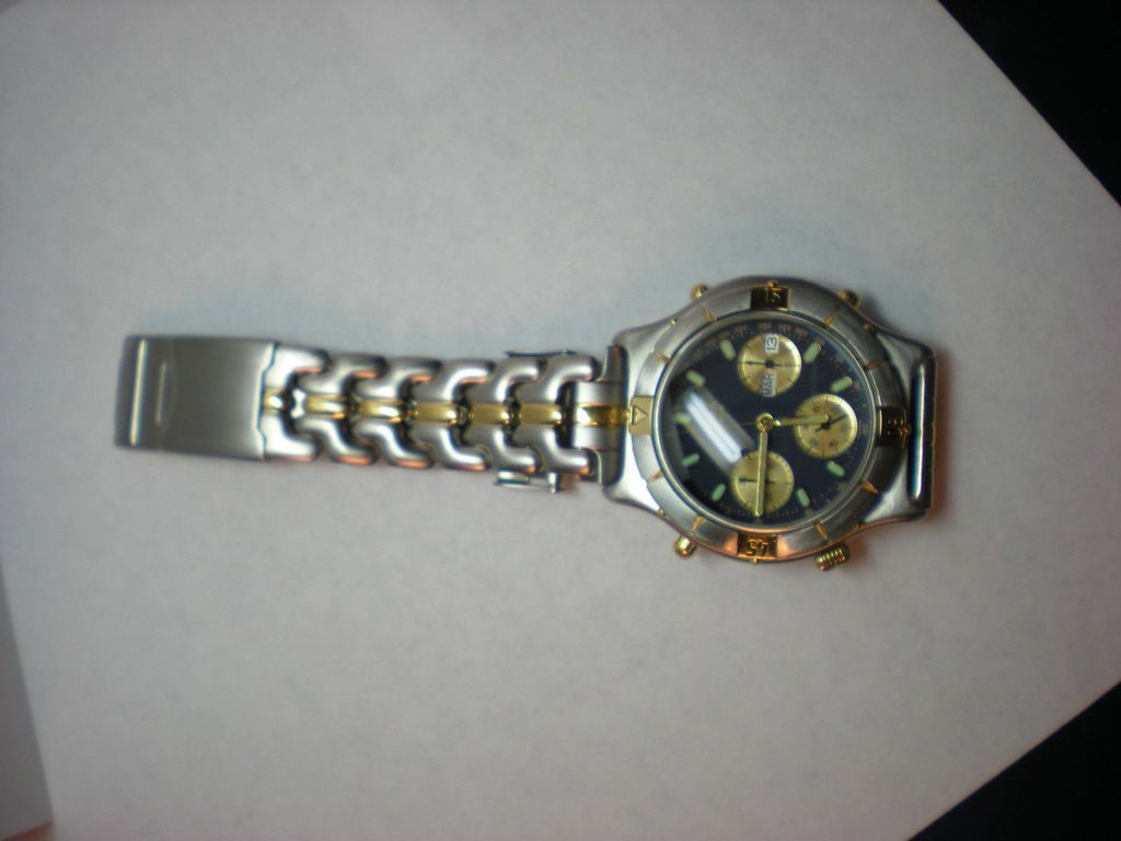 Apart from other inaccuracies and typo's, the would-be seller appears to have 'fat fingers' when it comes to TYping Yema. This Auction is for a Genuine TEMA of Paris true chronograph Wristwatch. This Timepiece is high Quality with a finely finished brushed round case that measures 40mm in diameter. The case and bracelet are all stainless steel with Gold trim points. A functional Bezel is stainless with gold trim at the five minutes with the 15, 30 and 45 minutes having Arabic numerals in black engraved on gold Bosses. There is also a gold triangle at the 12 point. The Bezel is uni-directional and functions as it should. The crystal is domed to the center for a magnifying effect and is clear and scratch free. The Dial is a dark navy blue with three gold finished sub-dials at the 3,6 and 9 oclocks. The 3 has a 1/10th sec. hand with a day date boxes across the center. The 6 oclock has the normal 60 seconds of normal time, while the 9 has the elapsed time from the long and gold chronograph sweep needle hand. The hands are gold and luminous fill. There are three gold finished pushers at the 2 the 4 and 10 oclock and a gold finished and knurled Crown for analog and day date functions. The case back is polished stainless is threaded for water resistance and etched with this models information. The movement is a well known high Quality 15 jewel all alloy Japan Quartz made by Seiko and referred to as the 7A38. This variant, the Shimauchi V906 is used by Cartier, Tag as well as Ferrari and Formula as the Cal531. This movement is considered the first all Quartz true Chronograph. It has been checked for operation and functions as it should and has a fresh battery. The bracelet is all stainless with a gold trim ring line its entire circumference. The tight M-link has a Z-deployment clasp with a safety clip over. This Tema looks new on the Wrist. Please consider the photos for additional information about the model and its condition. Also, please remember that the photos are taken at 4x for detail, and may show whiskers that cannot normally be seen with the unaided eyes. The case and bracelet have both been steam cleaned for the protection of the buyer. Feel free to contact me with any questions you might have about this Tema. Shipping is by Priority mail with traking and insurance for added security. | |