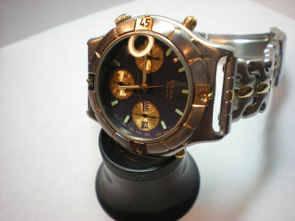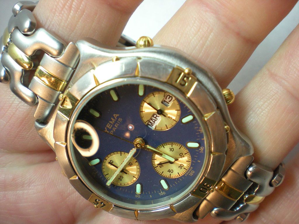 Belle montre vintage Yema nécessitant une remise en état : elle ne fonctionne plus. La partie chrono marche encore apparemment. Cette montre n'a subi aucun mauvais traitement (choc ou immersion prolongée). Elle n'a pas été bricolée non plus. La pile est neuve. Le verre n'est pas rayé contrairement à ce que la photo laisse croire. Elle valait plus de 2000 F dans les années 80. Bel exemplaire pour connaisseurs de la marque bisontine et méritant d'être réparé. Etanche à 40 M. As it transpired, the parochial narrow-minded French seller not only wouldn't ship outside France, but would only accept a cheque drawn on a French bank as payment. http://www.ebay.co.uk/itm/281833088654