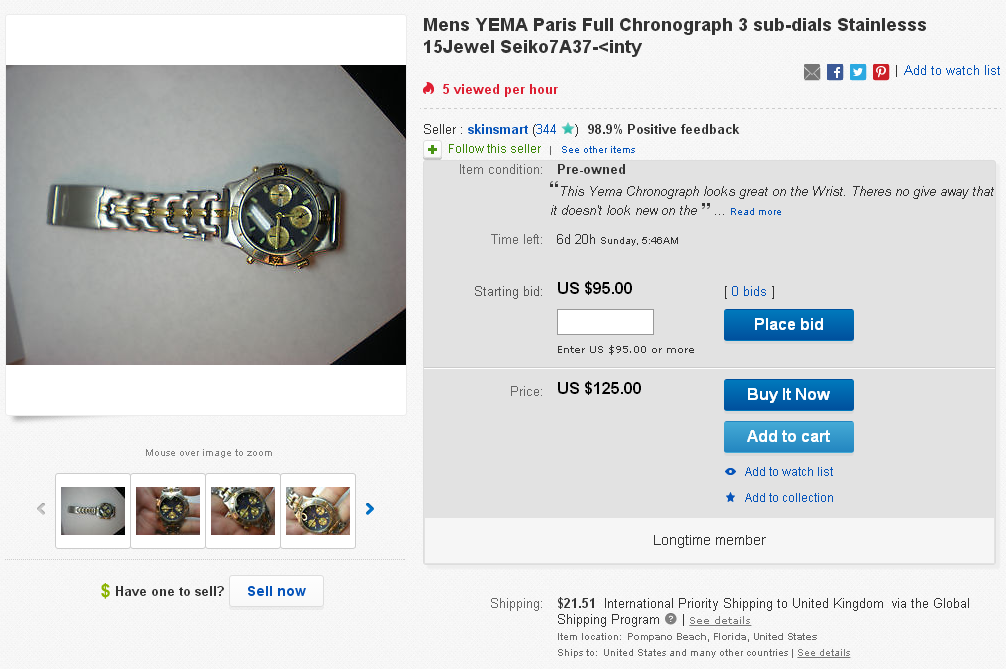 Something of a refreshing change to start the new page. O.K. - I concede: with the number of Yema Spationaute III's that I've already documented in this thread, maybe it's a case of plus ça change, plus c'est la même chose. It may not be the best example, by any means, but for once here's one listed on eBay France (by a zero-feedback French seller) with a sensible opening bid price ! http://www.ebay.co.uk/151841201956
