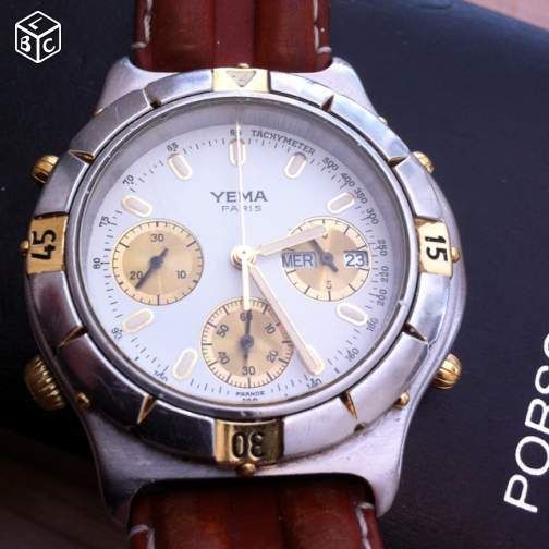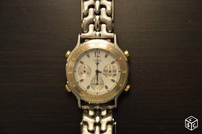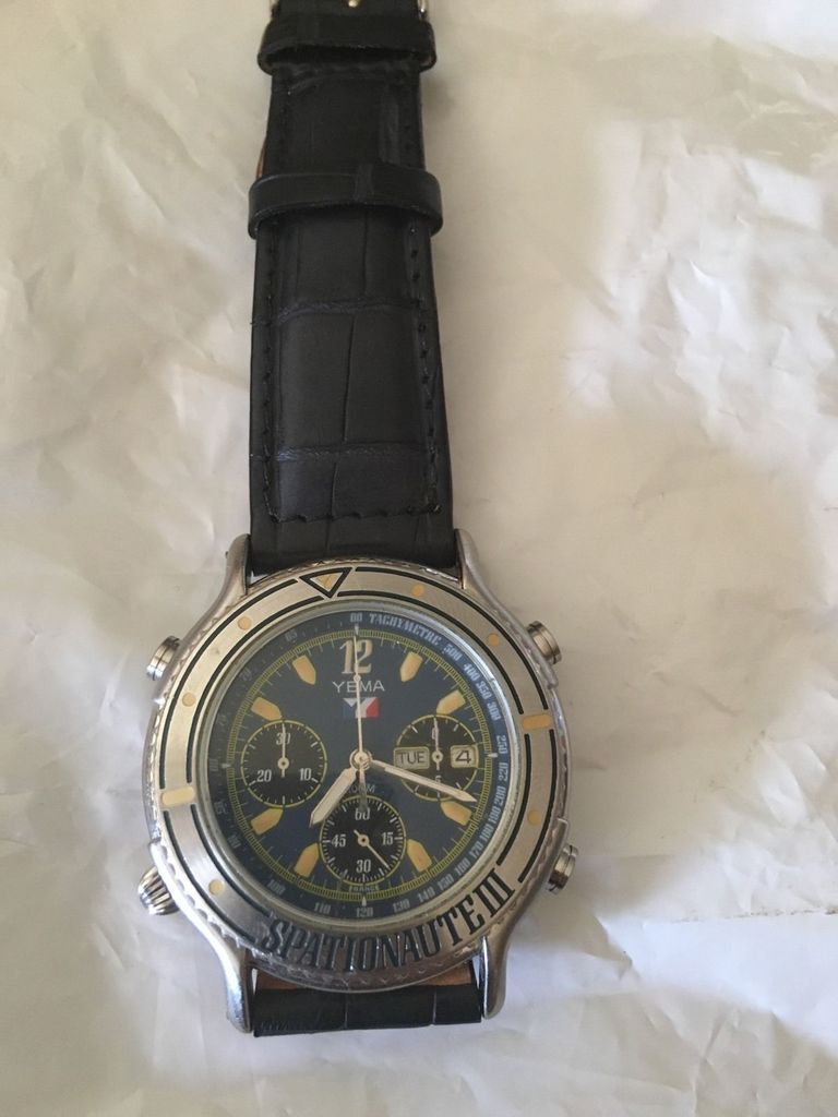 Vends Yema Spationaute III Boîtier acier Chrono Jour/date Tachymètre Légère rayures sur la vitre Pile à changer | |