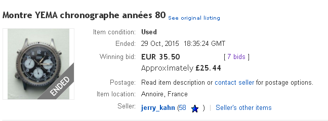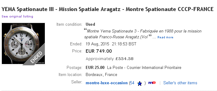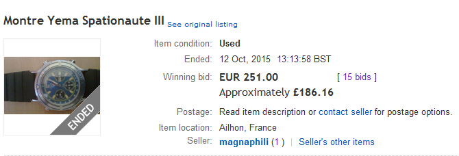 That French eBay auction for a Yema Spationaute III ended earlier this morning selling for 162 Euros (approx. £113.39) after 7 bids. http://www.ebay.co.uk/itm/131651374616