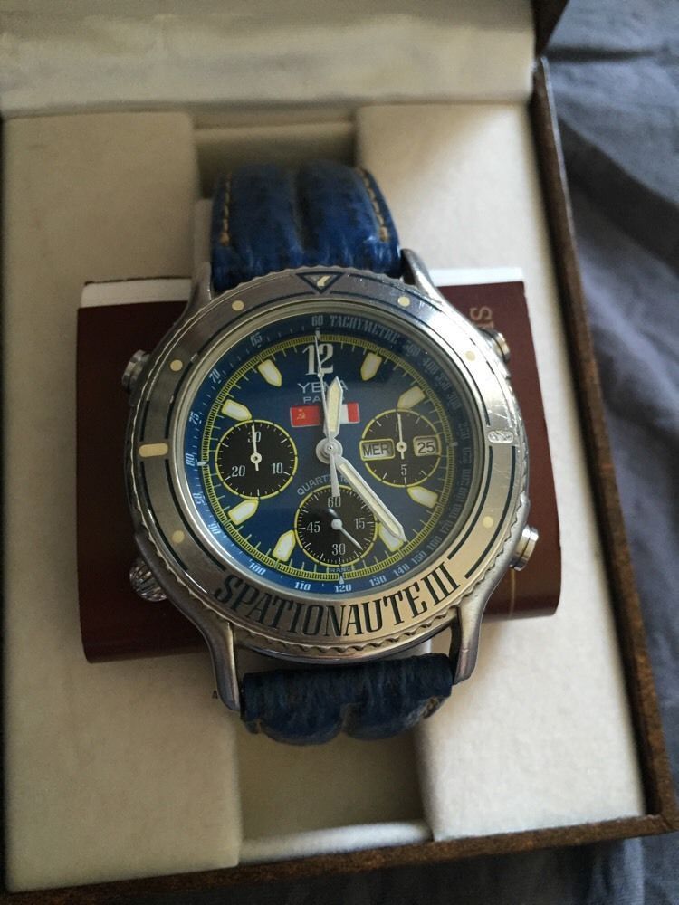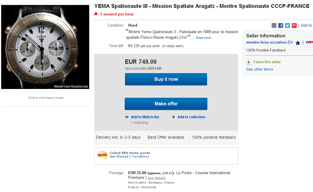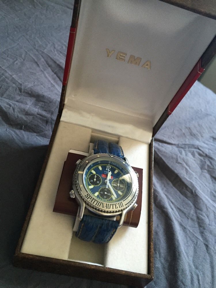 Here's another speculatively (read spectacularly) over-priced Yema Spationaute III which was listed on eBay earlier this week by a French seller. It's an early production watch with the desirable 'cadran drapeaux' mission flags dial; comes with box and papers. http://www.ebay.fr/itm/Montre-Yema-/172009903118