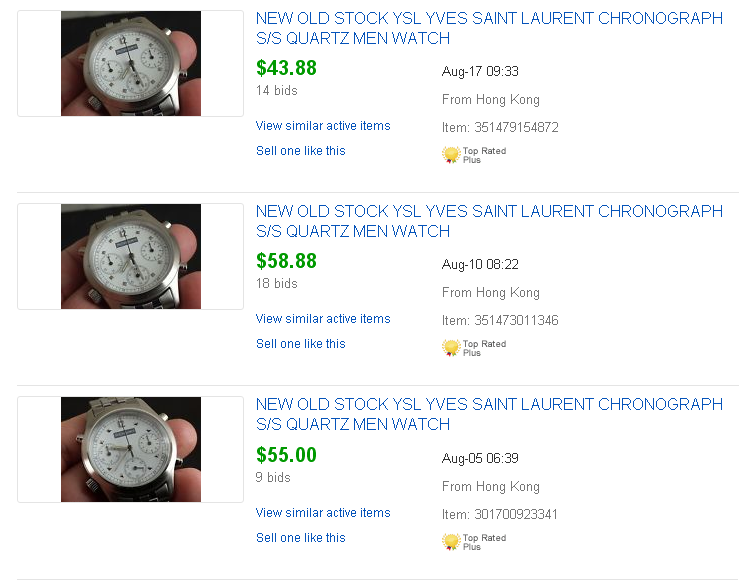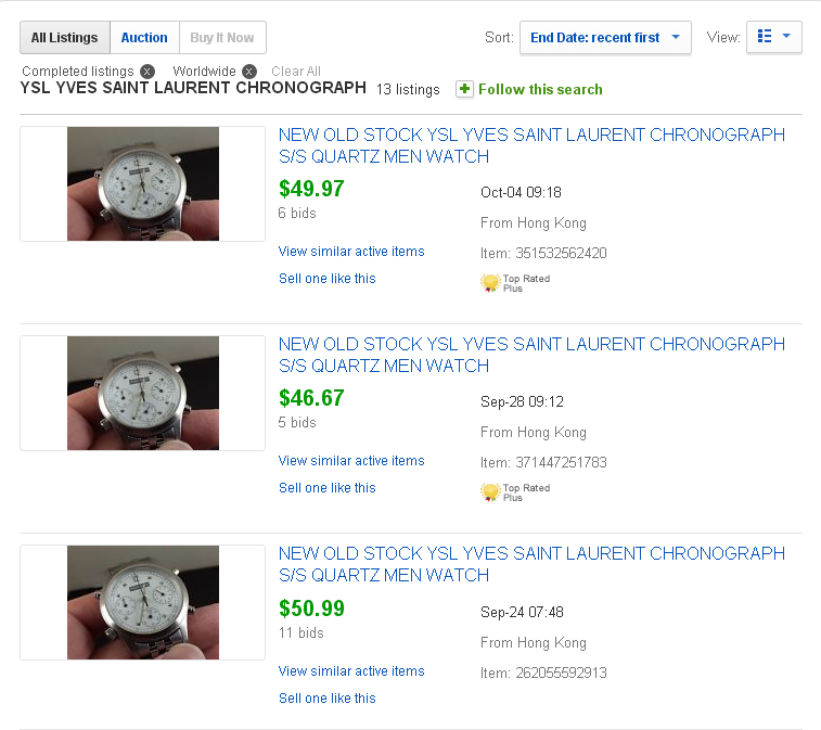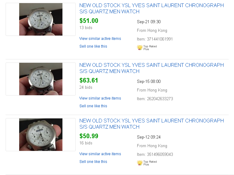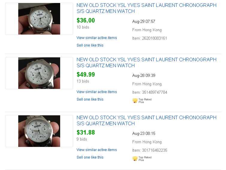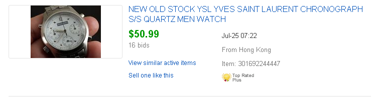 Remember the Yves Saint Laurent TD-780 '7A28's (actually Yema N7's) discussed at some length in this other thread ? Last year, they were being knocked out by Hong Kong eBay seller neverstrong on a fairly regular almost weekly basis. I'd have expected his supply of these less-than-desirable NOS 'fashion watches' to have been exhausted by now. Seems not - he's still going strong.