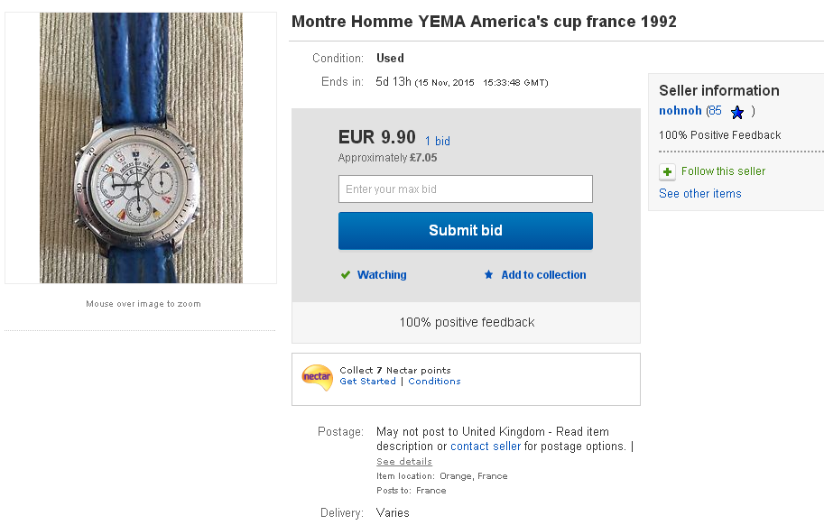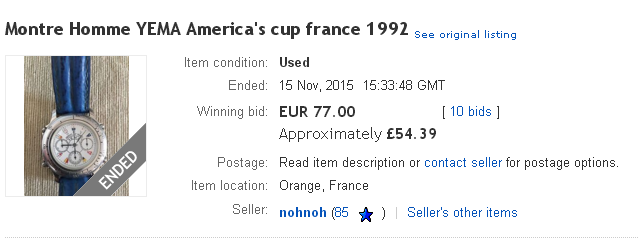 That French eBay auction for the Yema N71Z36 America's Cup ended earlier this afternoon, selling for 77 Euros after 10 bids: http://www.ebay.co.uk/itm/221935473374