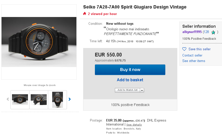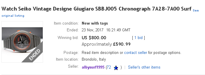 Coincidentally, there was what was quite possibly a decent used example of a 7A28-7A00 SBBJ005 listed on eBay Italy last week, as a 7-day auction, with an opening bid price of 124 Euros. The photos weren't the best, but the Italian seller described it (in English) as follows: This watch is an original and very rare seiko cronograph 7A28-7A00 by Giugiaro, it was bought by me in Rome in a jewelry almost 25 years ago, obv is not perfect as a brand new one , it was used a dozen of times in the late 90's so it has normal marks of wear, no original box and instruction, it works perfectly and got a new one duracell battery. The watch is 100% original in all parts. If you collected immaculated watch like me in the past please don't buy it. Out of curiosity; wondering what impact the recent surfeit of NOS examples might have on the selling price, I duly added it to my eBay watching page. The 7-day auction ended yesterday evening, with the 7A28-7A00 selling for a comparatively disappointing 196 Euros after 7 bids. | |