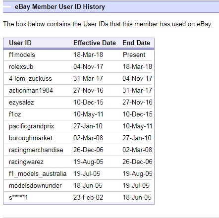 Needless to say, as with the other associated eBay accounts, this one has gone through a significant number of ID changes over the years. It's probably overdue another anyday soon.