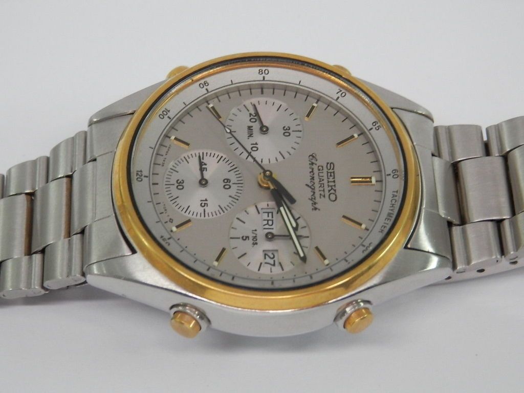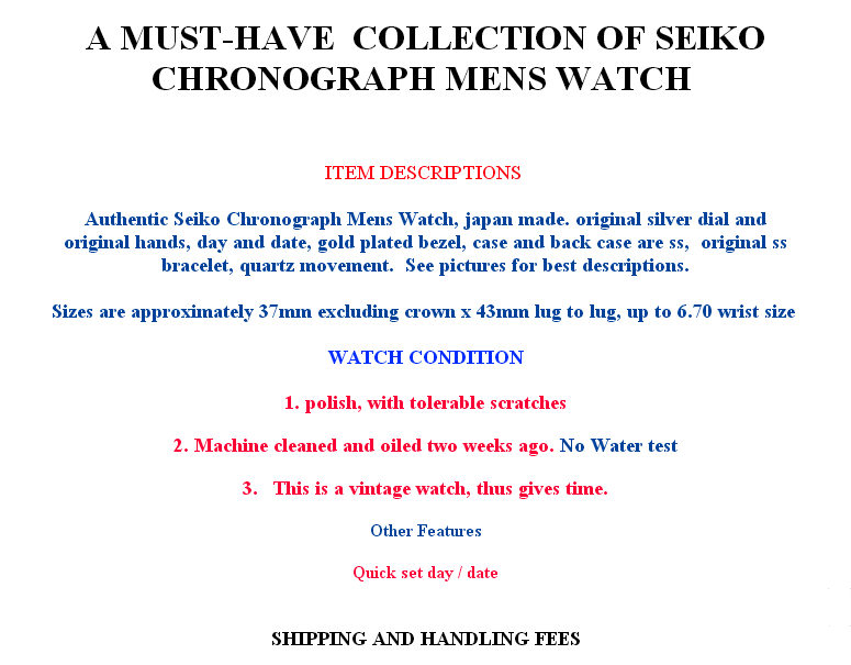 Dalla mia collezione vendo questo raro Cronografo SEIKO 7A38-7190 prodotto nel Gennaio 1987 ✔️La cassa in acciaio è in perfette condizioni e misura circa 37mm senza considerare la corona e i pulsanti del crono. ✔️Bellissimo quadrante originale, lancette ed indici originali in eccellenti condizioni. ✔️I giorni della settimana sono in Inglese-Francese. ✔️Cristallo perfetto, senza graffi. ✔️Bracciale originale B1405.E per dimensioni del polso max 22cm. ✔️Il movimento funziona perfettamente e tutte le funzioni cronografiche sono OK, l'azionamento dei pulsanti cronografici è netto e senza esitazioni. ✔️Batteria nuova. È davvero un cronografo SEIKO da collezionare, in ottime condizioni originali: molto bello e attraente sul polso con un look moderno ancora oggi. Si prega di fare riferimento alle foto, sono parte integrante della descrizione. CONDIZIONI QUESTA E’ UNA VENDITA PRIVATA E VALE LA REGOLA VISTO E PIACIUTO, QUINDI NON ACCETTO RESTITUZIONE PER RIPENSAMENTO. La restituzione è accetta solo per oggetto non conforme alla descrizione - spese di rientro a carico del venditore e restituzione dell' importo pagato per l'oggetto comprese le eventuali spese di spedizione originali, dopo il rientro dell'articolo e sua verifica. FEEDBACK Se ci sono problemi, prima di lasciare un feedback contattami, sono disponibili a risolvere qualsiasi disguido. Il feedback è uno strumento per capire l’affidabilità e serietà di un venditore e non per risolvere dispute o chiedere rimborsi. Offro massima disponibilità e sono convinto che la comunicazione sia il miglior modo per risolvere qualsiasi dubbio o eventuale malintesi. ############ From my collection I sell this rare SEIKO 7A38-7190 Chronograph produced in Gennaio 1987. ✔️The steel case is in perfect conditions and measures about 37mm without considering the crown and the chrono buttons. ✔️Perfect crystal, without scratches. ✔️Beautiful original dial, original hands and markers in excellent conditions. ✔️The days of the week are in English-French ✔️Original bracelet B1405.E for wrist size max 22cm. ✔️The movement works perfectly and all the chronographic functions are OK, the chronograph buttons work crispy. ✔️New battery. It really is a Seiko chronograph to collect, in excellent original condition very nice and eye-catching on the wrist with a modern look still today. Please refer to the photos, they are an integral part of the description. TERMS THIS‘ A SALE PRIVATE, AND THAT IS THE RULE SEEN AND LIKED, I DO NOT ACCEPT RETURN FOR AFTERTHOUGHT The refund is accepted only for object not compliant to the descriction – return expense borne by to the seller and the refund of the amount you paid for the object including any costs of original shipping after the return of article and its verification. FEEDBACK If there are problems, please contact me before you give feedback, I am available to solve any mistake. The feedback and’ a tool for understanding the reliability’ of a seller and not to resolve disputes or ask for refunds. I offer maximum availability’ and I am convinced that the communication is the best way to solve any doubt or any misunderstandings. I wouldn't give 95 Euros for it. Then again, I don't need to. Here's how it should look.