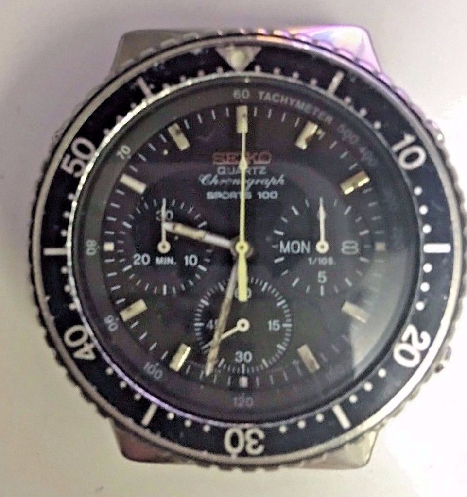 This 7A38-7080, which has been almost completely stripped of its black chrome coating was listed this morning by Italian eBay seller pichimmi.You can still see traces of the black coating in the bezel and crown nurling and around the pusher housings. It's fitted with a non-original Seiko 20mm bracelet (possibly a p/n Z1118S, but which I can't accurarately identify from the seller's photos) that appears to have been lightly bead-blasted to match the case. With an opening bid price of 120 Euros, it's certain to appeal to someone. http://www.ebay.co.uk/itm/302272908535