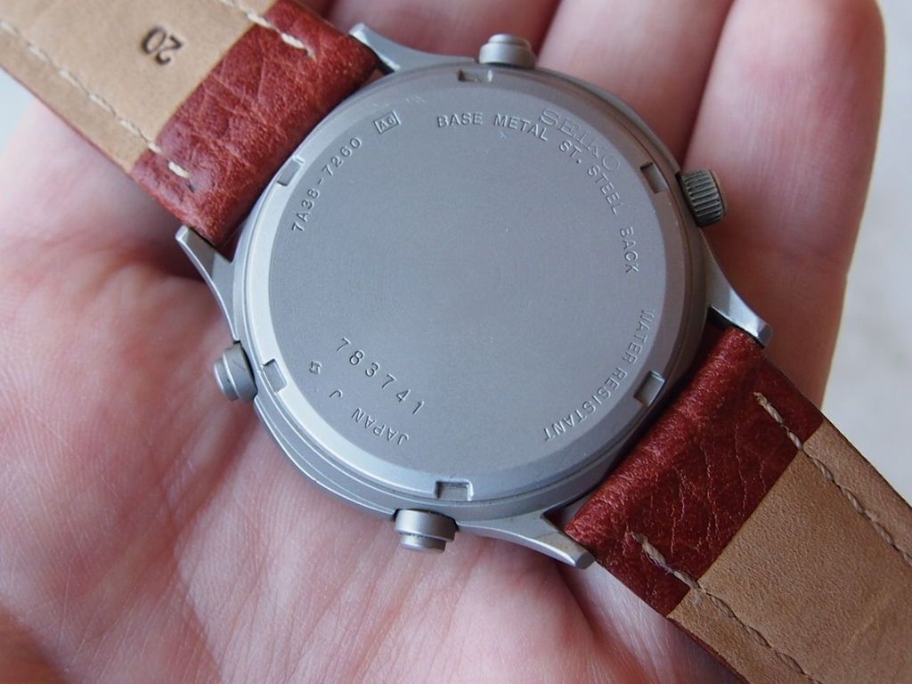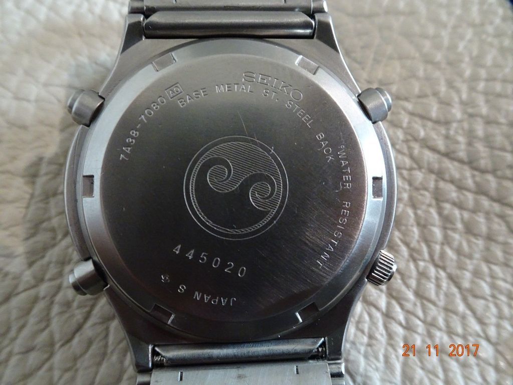What may also serve to add to any newbie's confusion is that such a thing as a stainless 7A38-727A does exist. It's quite a different watch. There's also a stainless 7A38-727B, which has a similar dial (but with silver batons and logo, rather than gold). Anyway, here's what this watch would have looked like originally: